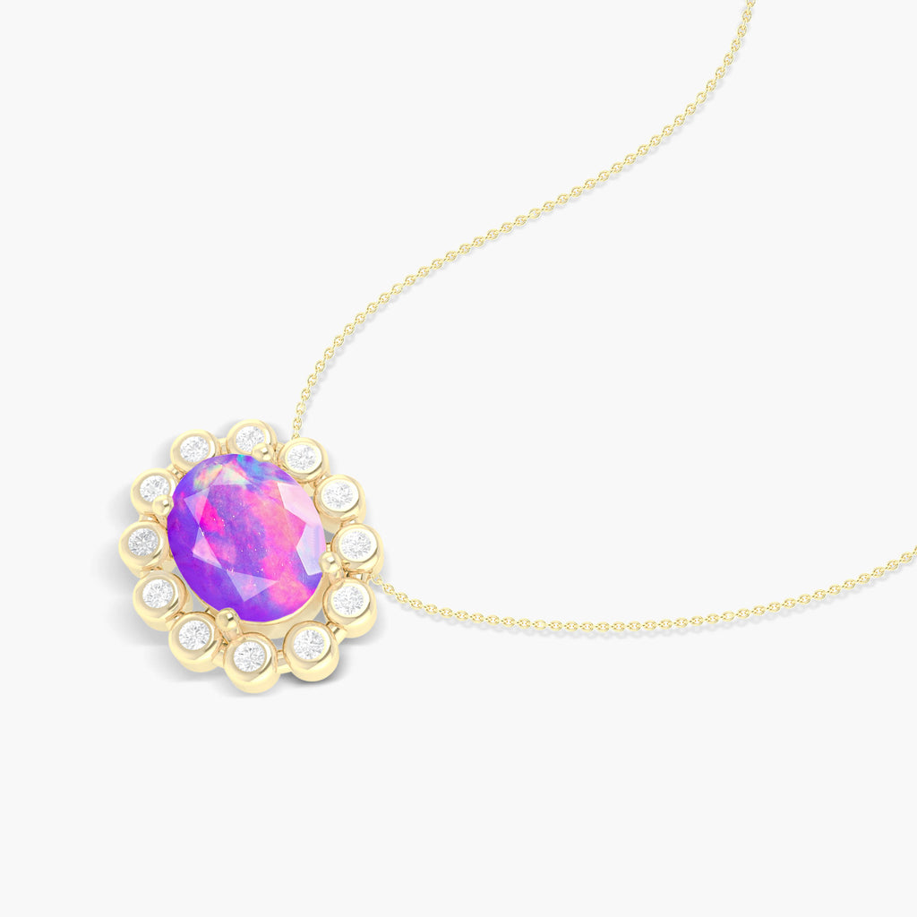Lavender OpalElevate your elegance with this exquisite Oval Stone Halo Pendant Necklace, featuring a mesmerizing Lavender Opal set in 925 sterling silver. The smooth 9x7 mm oval opal radiates a soft, ethereal glow, encircled by a delicate halo for added brilliance. Suspended on a 16"+2" adjustable cable chain with a secure lobster clasp, this pendant offers both comfort and style. Weighing approximately 3.10 gm, it balances sophistication and everyday wearability. Perfect for gifting or adding a touch of luxury to your jewelry collection, this timeless piece complements any outfit with its subtle yet striking charm.