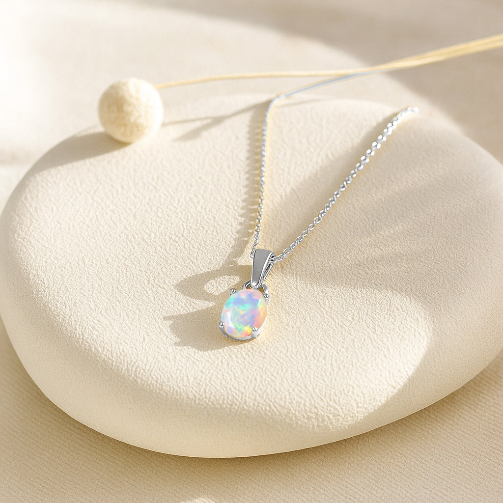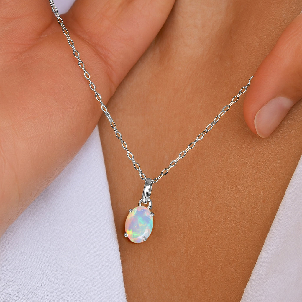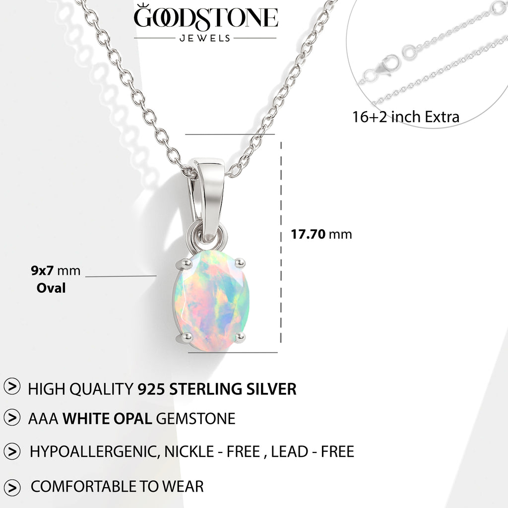 White OpalMake a bold statement with this White Opal Oval Teardrop Pendant Necklace, crafted in premium 925 sterling silver. The smooth 9×7 mm oval-cut white opal, weighing 1.20 carat, reveals captivating flashes of color within its dark, mysterious sheen. The 17.70×7.00 mm pendant hangs from a 16″ + 2″ adjustable cable chain, offering comfort and versatility. With an approximate weight of 1.60 g, this piece blends elegance and modern allure perfect for any jewelry collection.
