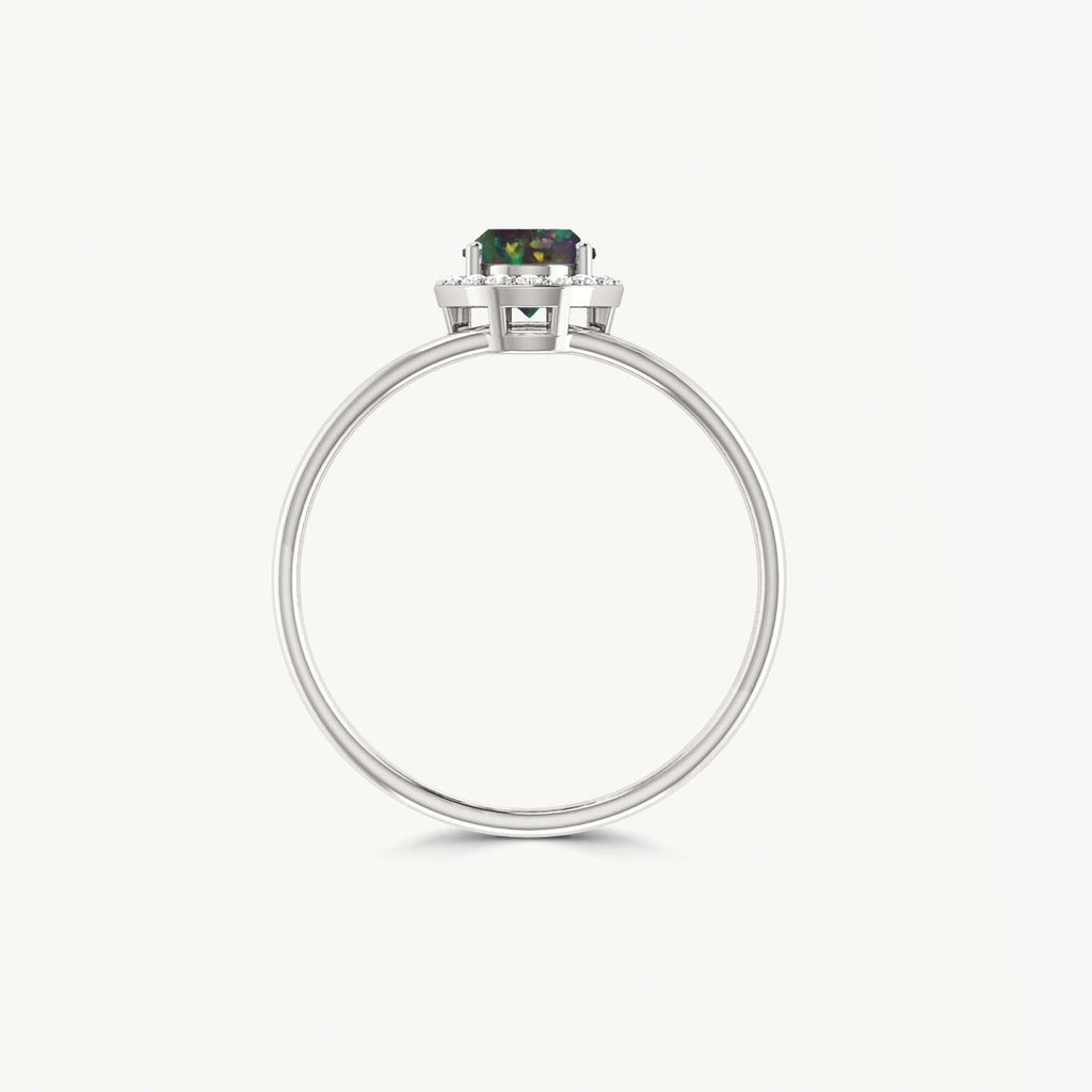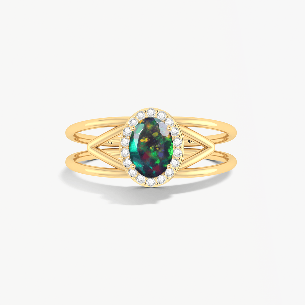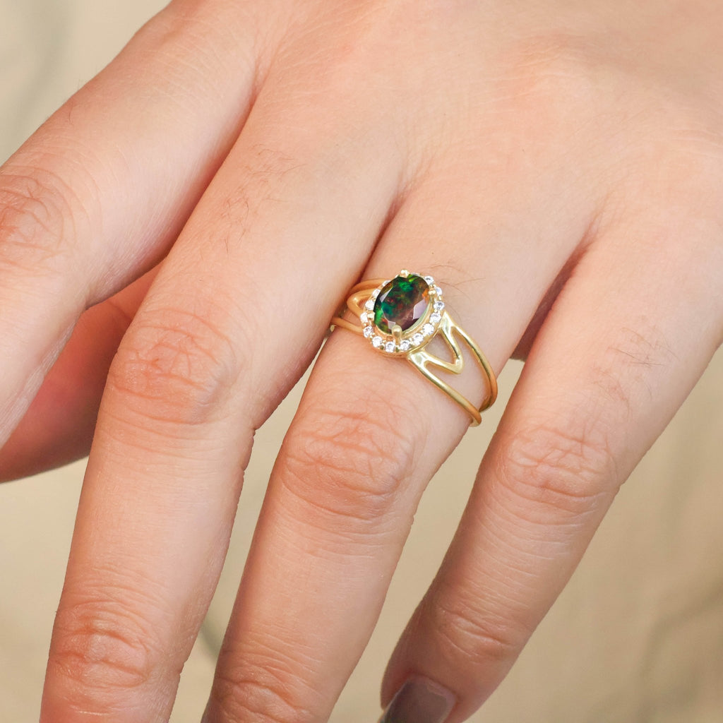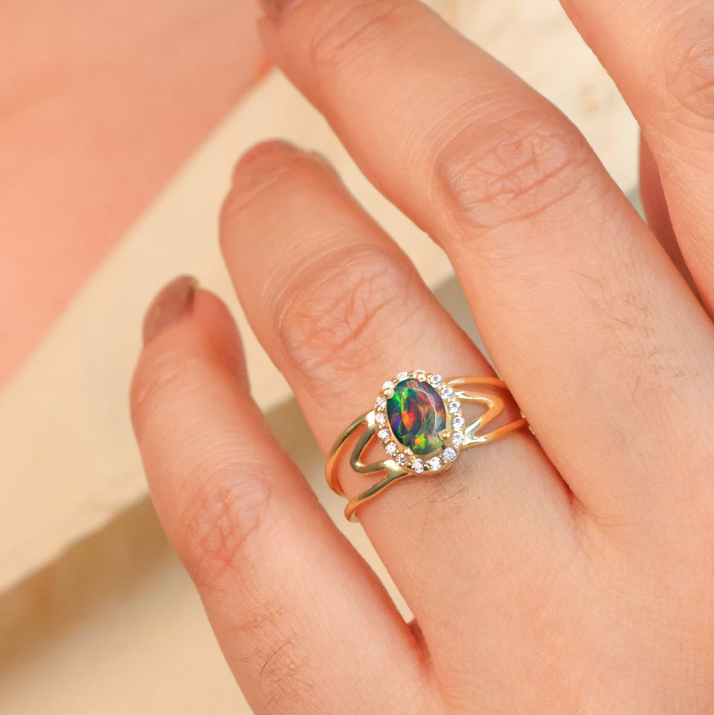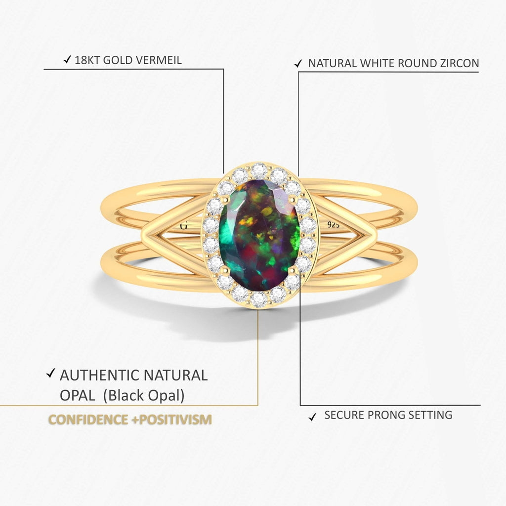 Elevate your special day with our Gorgeous Black fire oval Ethiopian opal gold wedding ring. Crafted with 18k gold Vermeil or 925 Sterling silver, this elegant ring will add the perfect touch of sophistication and beauty to any outfit. Perfect for engagements and weddings, this ring is sure to make a lasting impression.