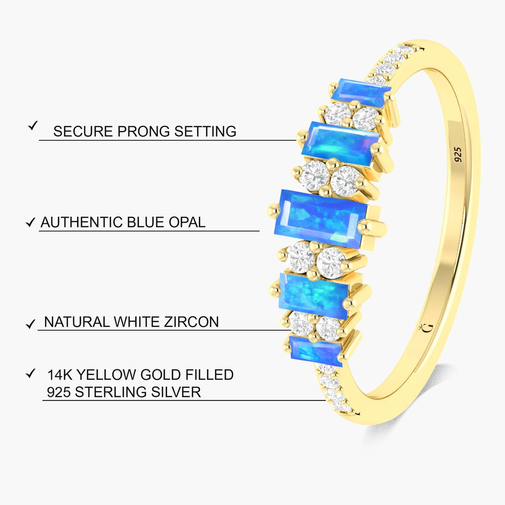 Blue OpalThis ring features a beautiful baguette -shaped Ethiopian Opal with a soft, classic glowing look. Sparkling round cubic zirconia diamonds add a touch of sparkle. The ring is made of sterling silver and is perfect for everyday wear or special occasions.