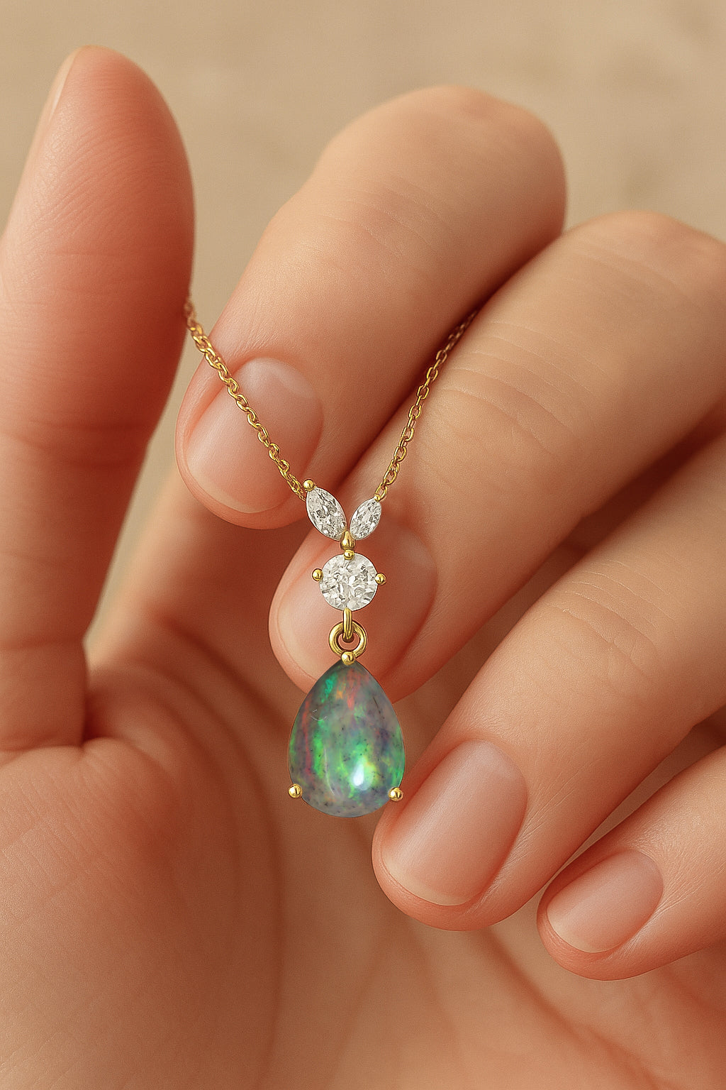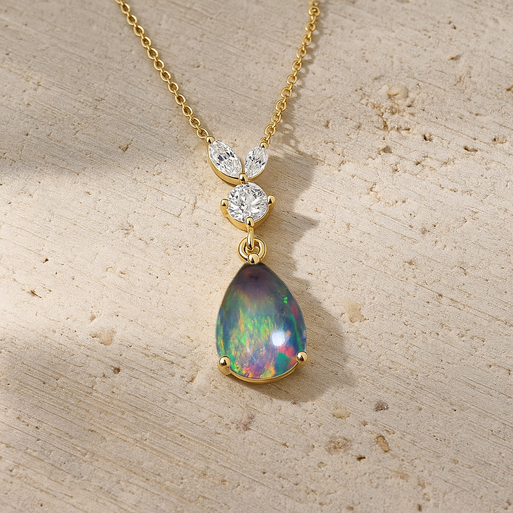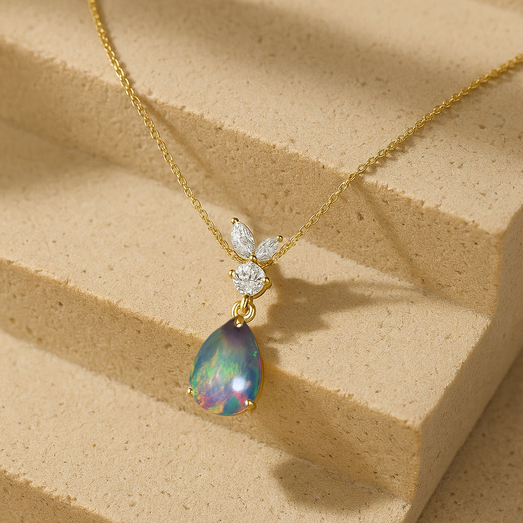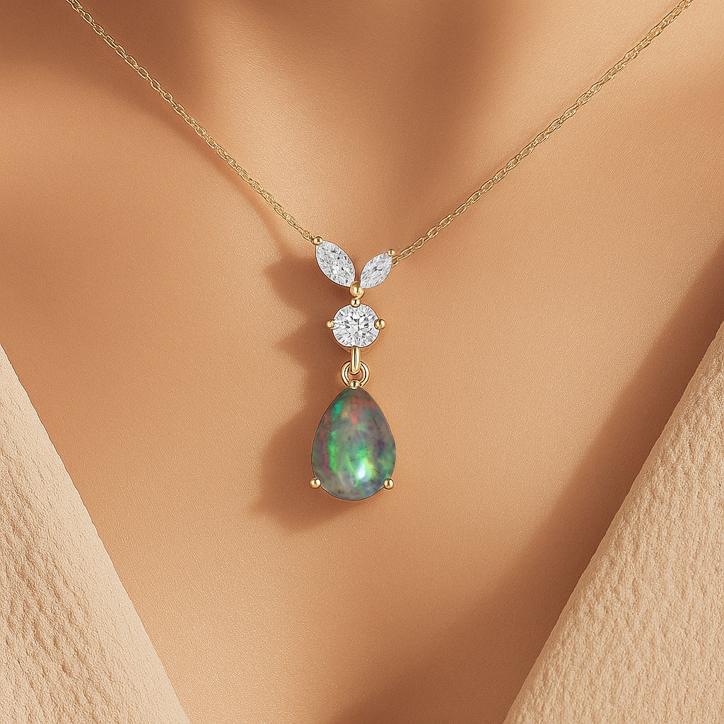 Black OpalAdd a touch of timeless grace with this Black Opal Pear Stone Teardrop Pendant Necklace, beautifully crafted in 925 sterling silver. The smooth 10x7 mm pear shaped opal (1.70 carat) radiates a soft, luminous glow, creating an elegant focal point for any look. Designed with a refined 21.06 x 7.31 mm pendant size, it hangs from a classic 16"+2" adjustable cable chain secured with a durable lobster clasp. Weighing approximately 1.70 gm, it offers a lightweight yet luxurious feel. Perfect for both everyday wear and special occasions, this pendant adds a serene, sophisticated charm to any jewelry collection.