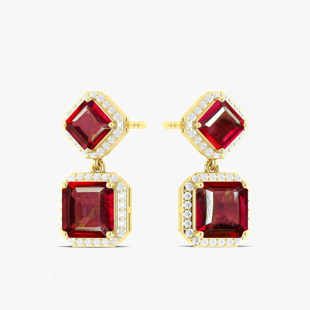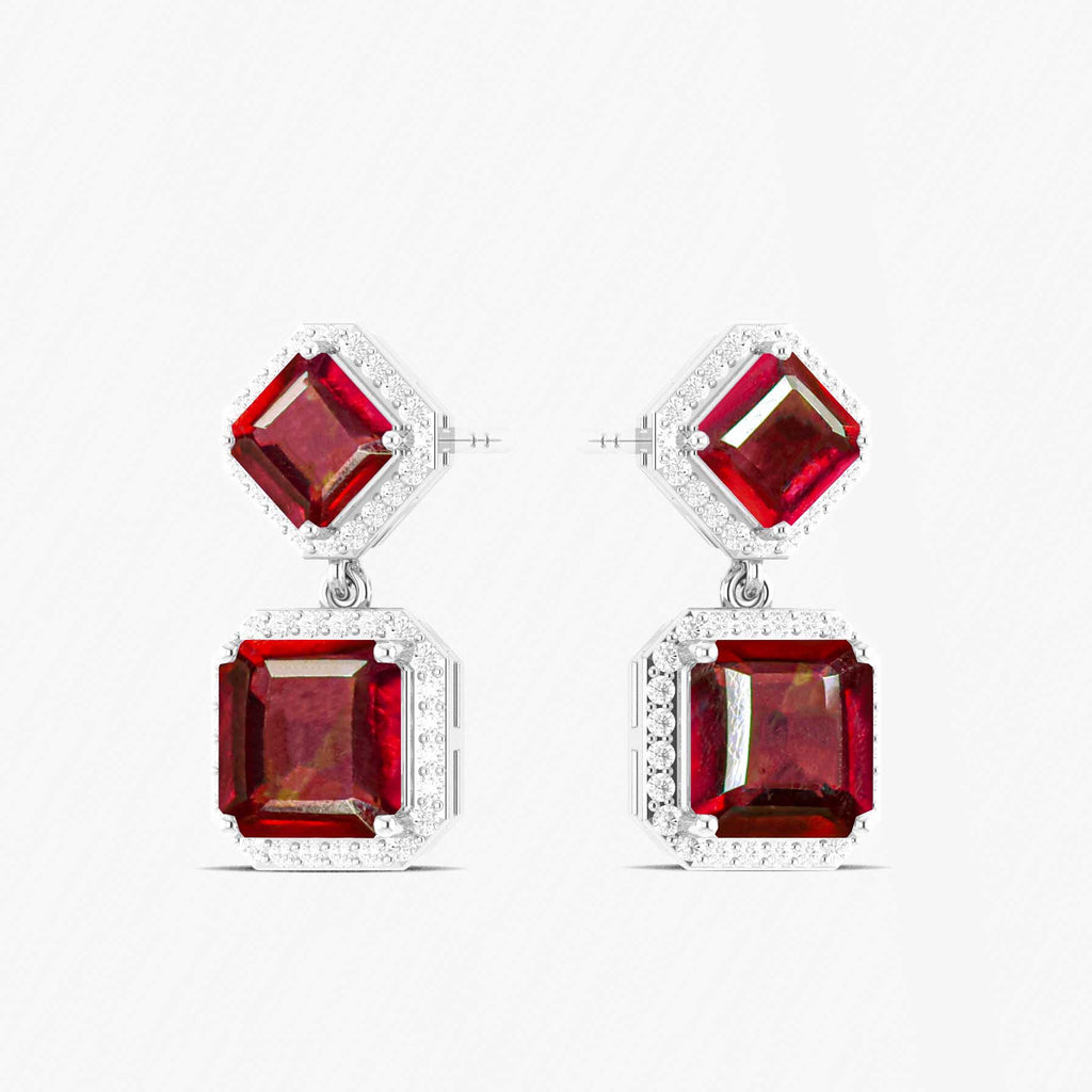 RubyBold ruby 7x5mm octagon halo drop earrings crafted in 925 sterling silver, featuring 4ct of vibrant rubies with a sparkling halo. Measuring 20.9x10mm with secure push-back closure. Elegant and eye-catching, perfect for special occasions or adding a luxurious touch to any outfit.
