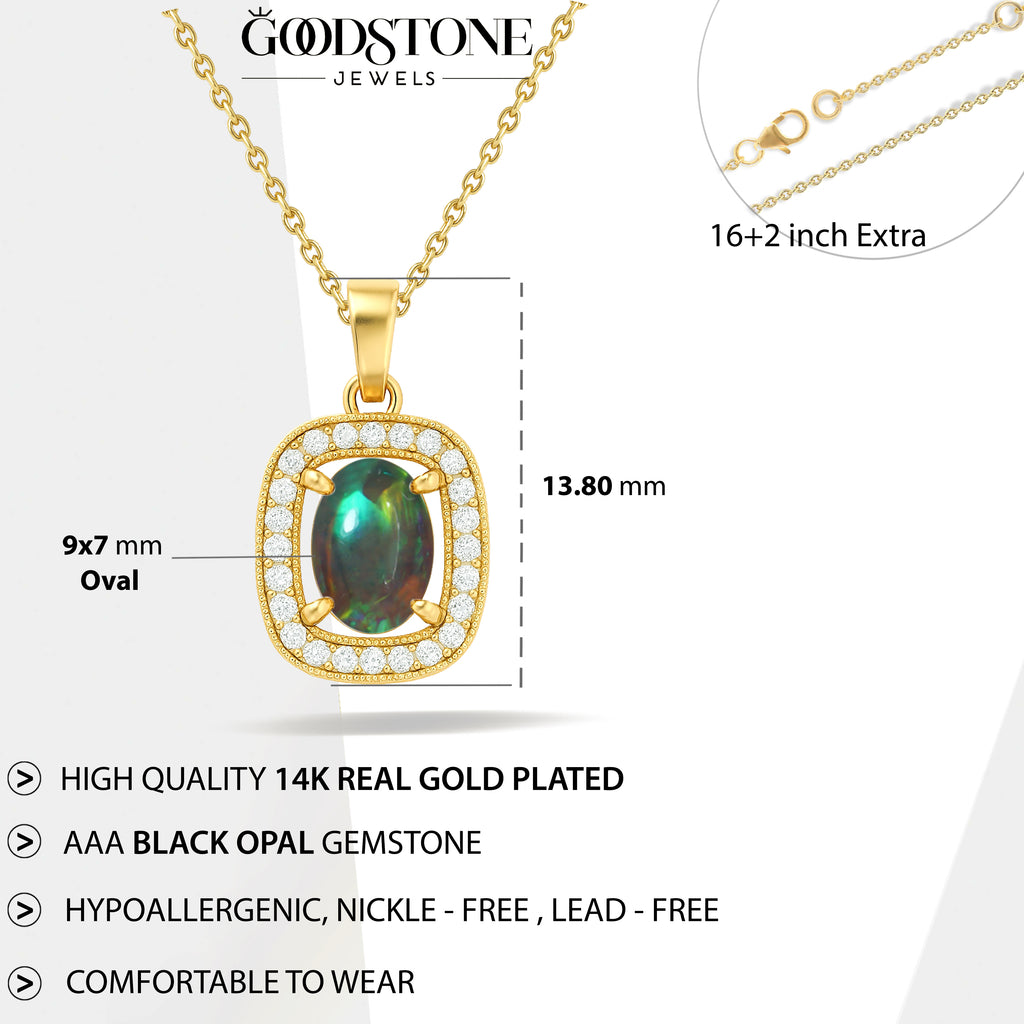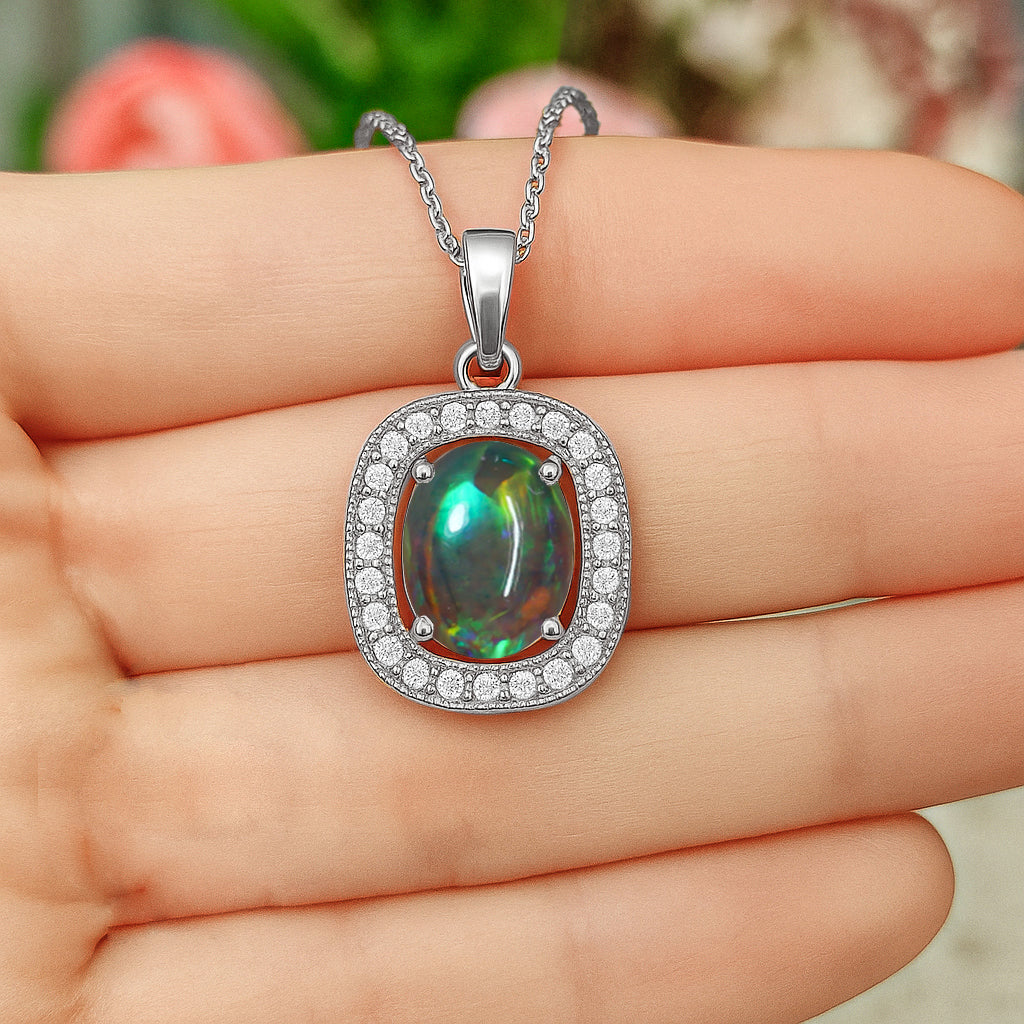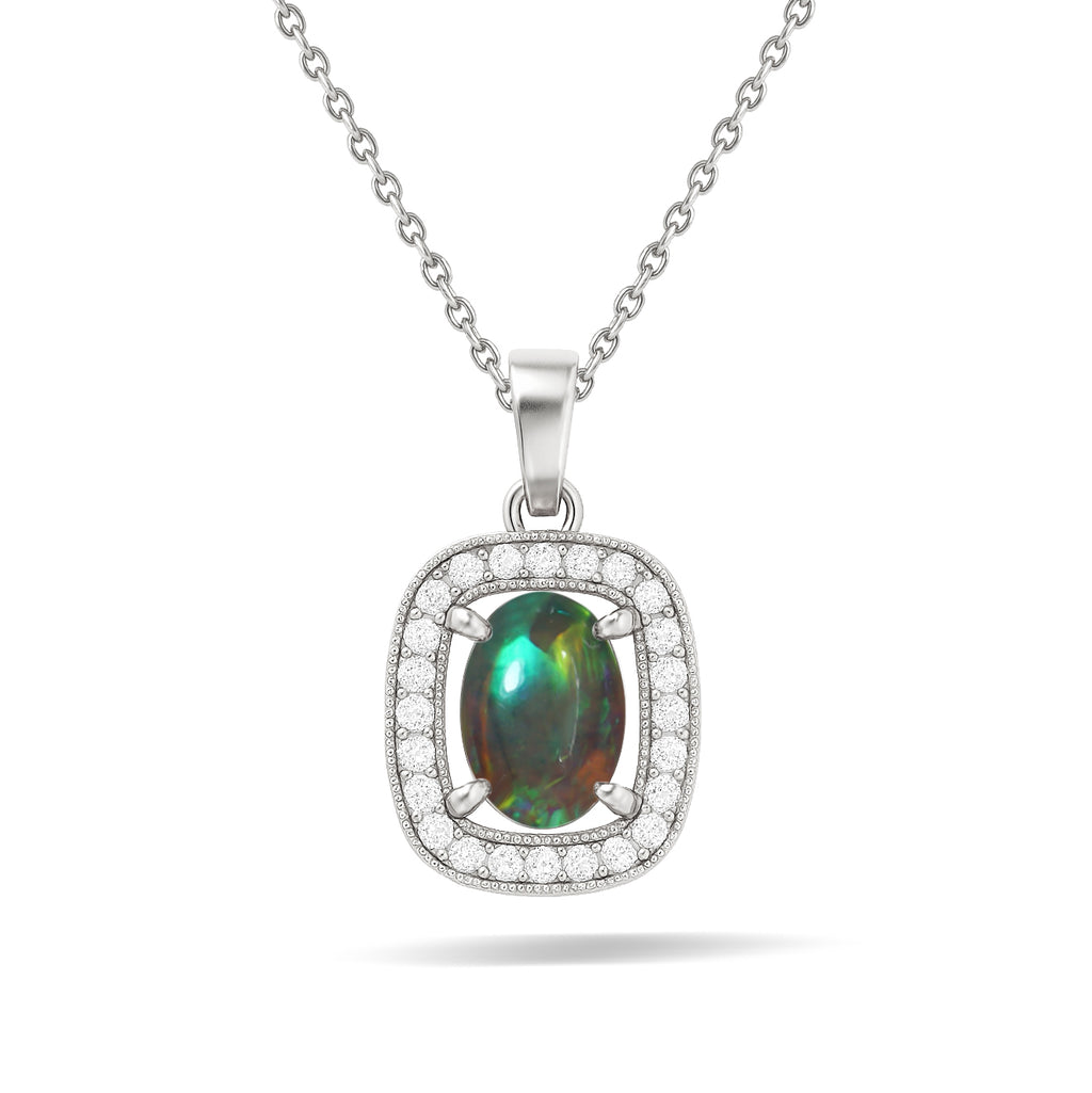 Black OpalElevate your style with this elegant Black Opal Oval Halo Pendant Necklace, crafted in premium 925 Sterling Silver. The smooth 9x7 mm opal (1.2 carat) sits beautifully within a classic halo frame, offering a radiant and timeless look. Measuring 12.80 x 11.80 mm, it comes with a 16" + 2" adjustable cable chain and secure lobster clasp. Lightweight at 1.65 g, this pendant adds a graceful touch to both everyday wear and special occasions. Perfect for gifting or personal elegance.