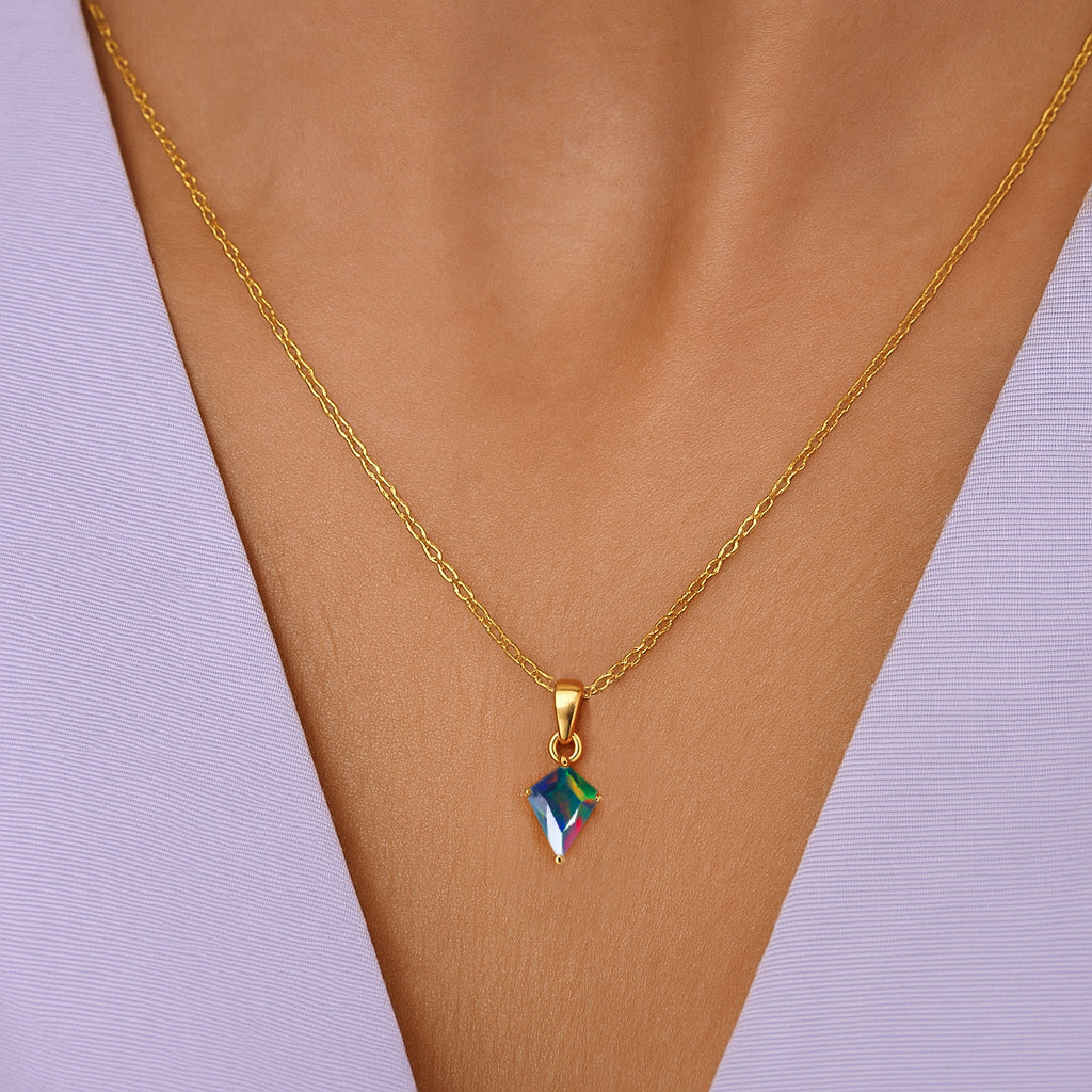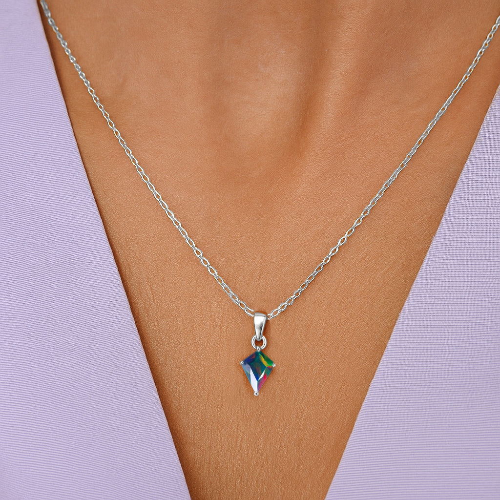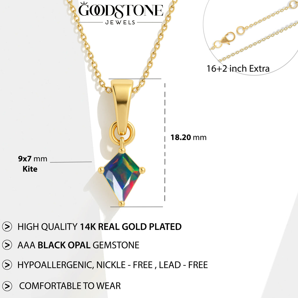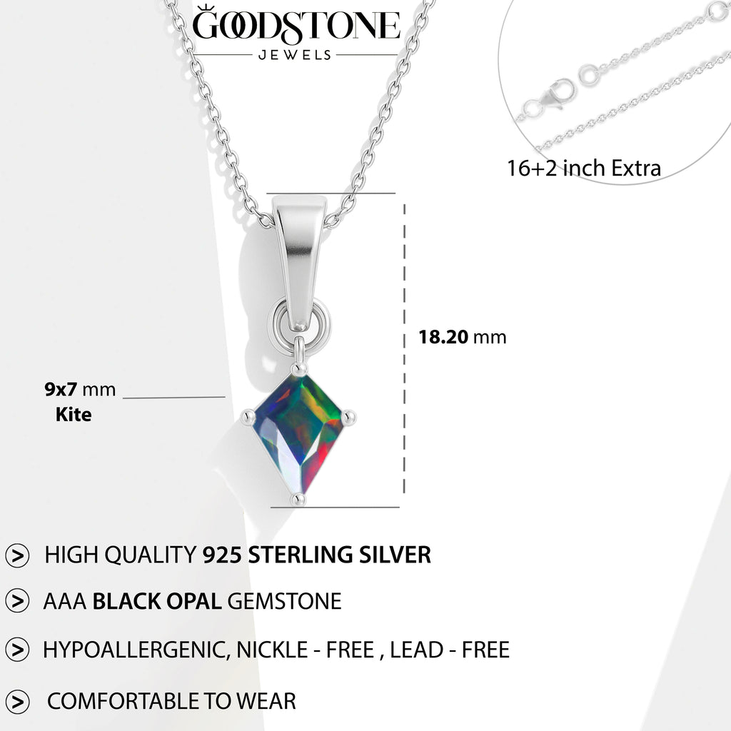 Black OpalEnhance your style with this stunning Black Opal Kite Stone Pendant Necklace, crafted in premium 925 sterling silver. The pendant features a vibrant 7×9 mm kite-cut black opal weighing 1.20 carat, offering a unique shape and brilliant color. Measuring 18.20×7.40 mm, it creates a graceful, elongated silhouette. Paired with a 16″ + 2″ adjustable cable chain and weighing approximately 1.30 g, this lightweight yet luxurious necklace is perfect for both everyday elegance and special occasions.