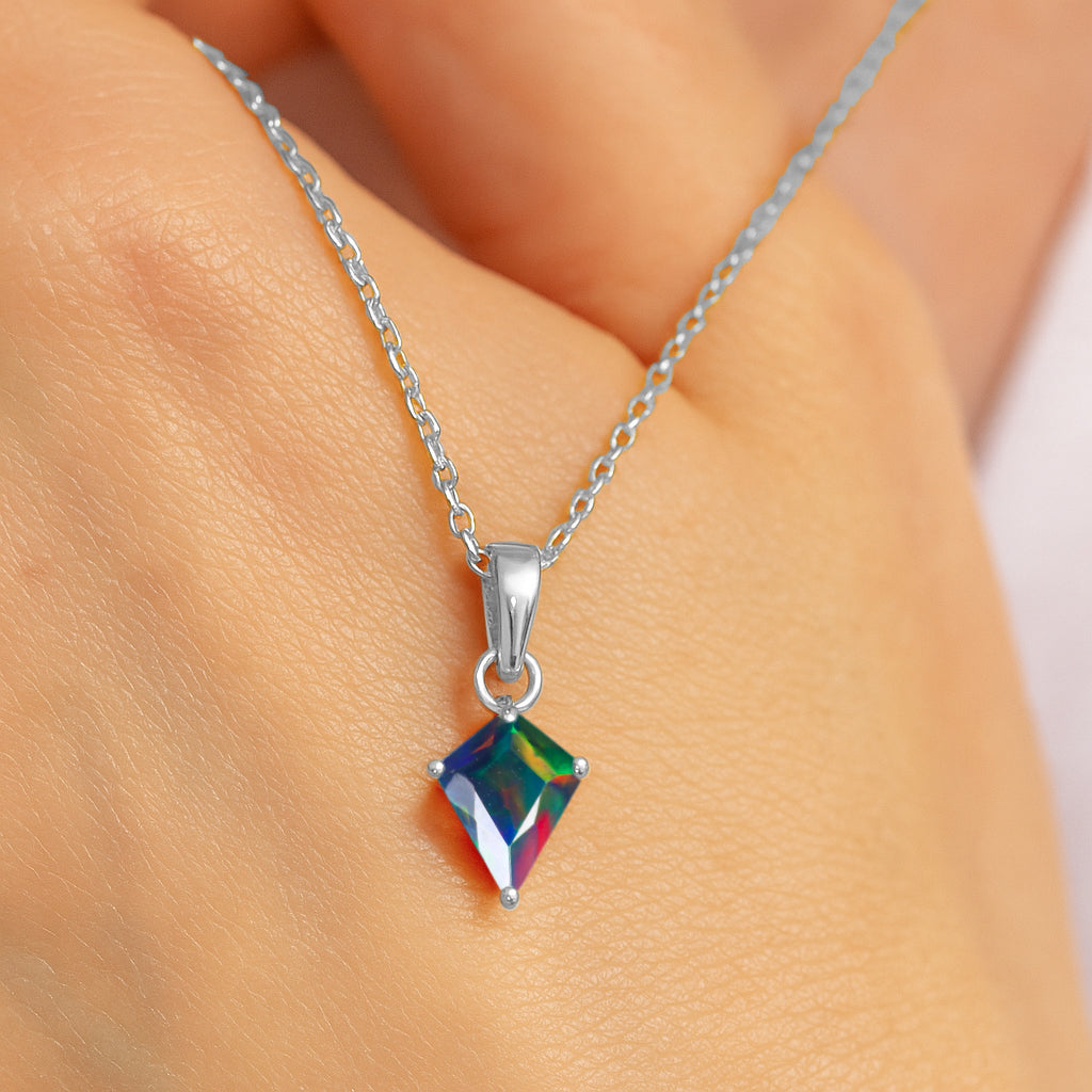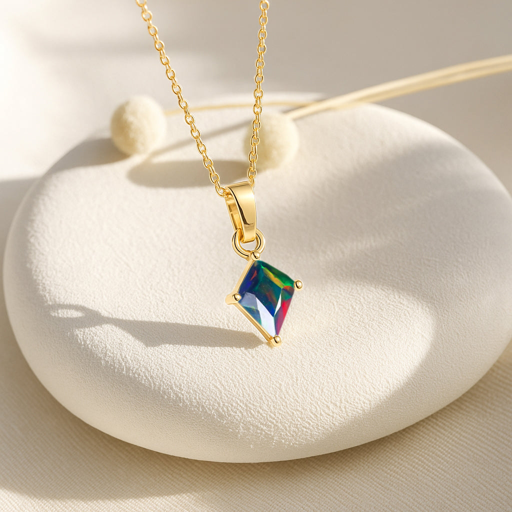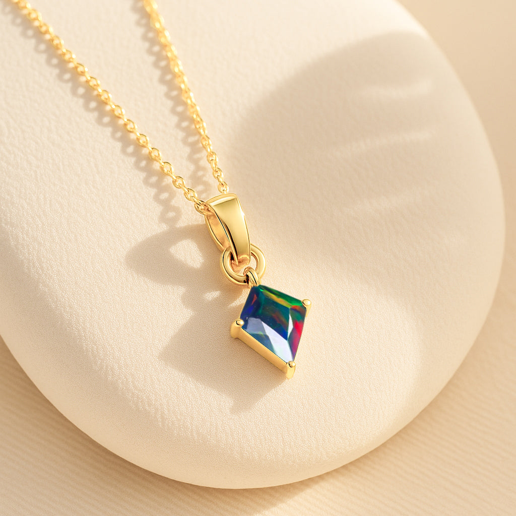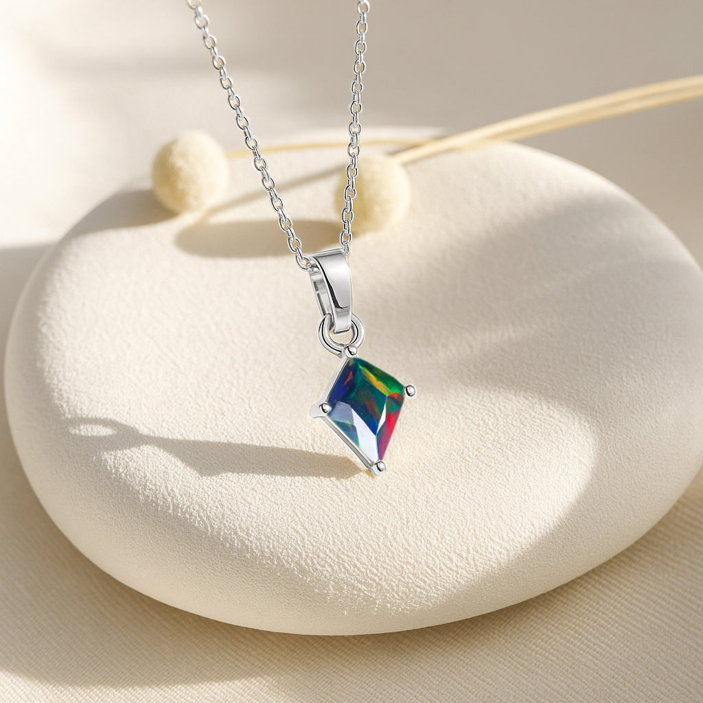 Black OpalEnhance your style with this stunning Black Opal Kite Stone Pendant Necklace, crafted in premium 925 sterling silver. The pendant features a vibrant 7×9 mm kite-cut black opal weighing 1.20 carat, offering a unique shape and brilliant color. Measuring 18.20×7.40 mm, it creates a graceful, elongated silhouette. Paired with a 16″ + 2″ adjustable cable chain and weighing approximately 1.30 g, this lightweight yet luxurious necklace is perfect for both everyday elegance and special occasions.
