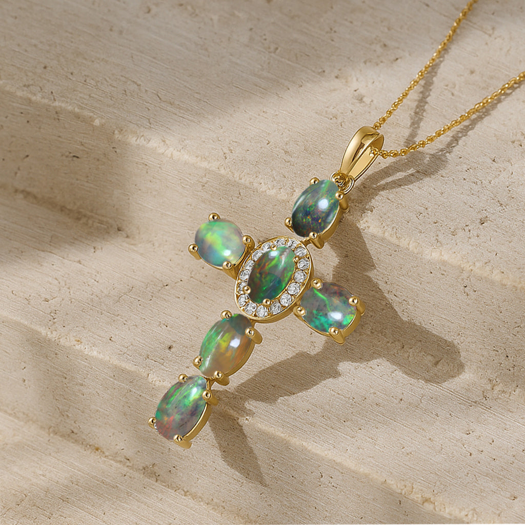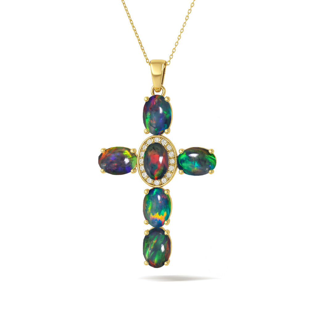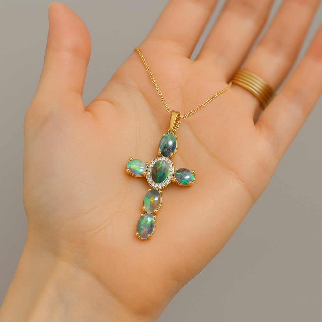 Black OpalElevate your spiritual style with this exquisite Black Opal Oval Holy Cross Pendant Necklace, beautifully crafted in 925 Sterling Silver for timeless elegance. Featuring a luminous 6x4 mm smooth oval Black Opal totaling 2.40 carats, the pendant showcases a radiant cross design measuring 34.19 x 19.98 mm, offering a graceful blend of devotion and sophistication. Suspended on a 16" + 2" adjustable cable chain with a secure lobster clasp, this 3.50 gm approx necklace is perfect for daily wear, gifting, or meaningful occasions. A luxurious statement piece for women who appreciate spiritual jewelry with a refined, modern touch.