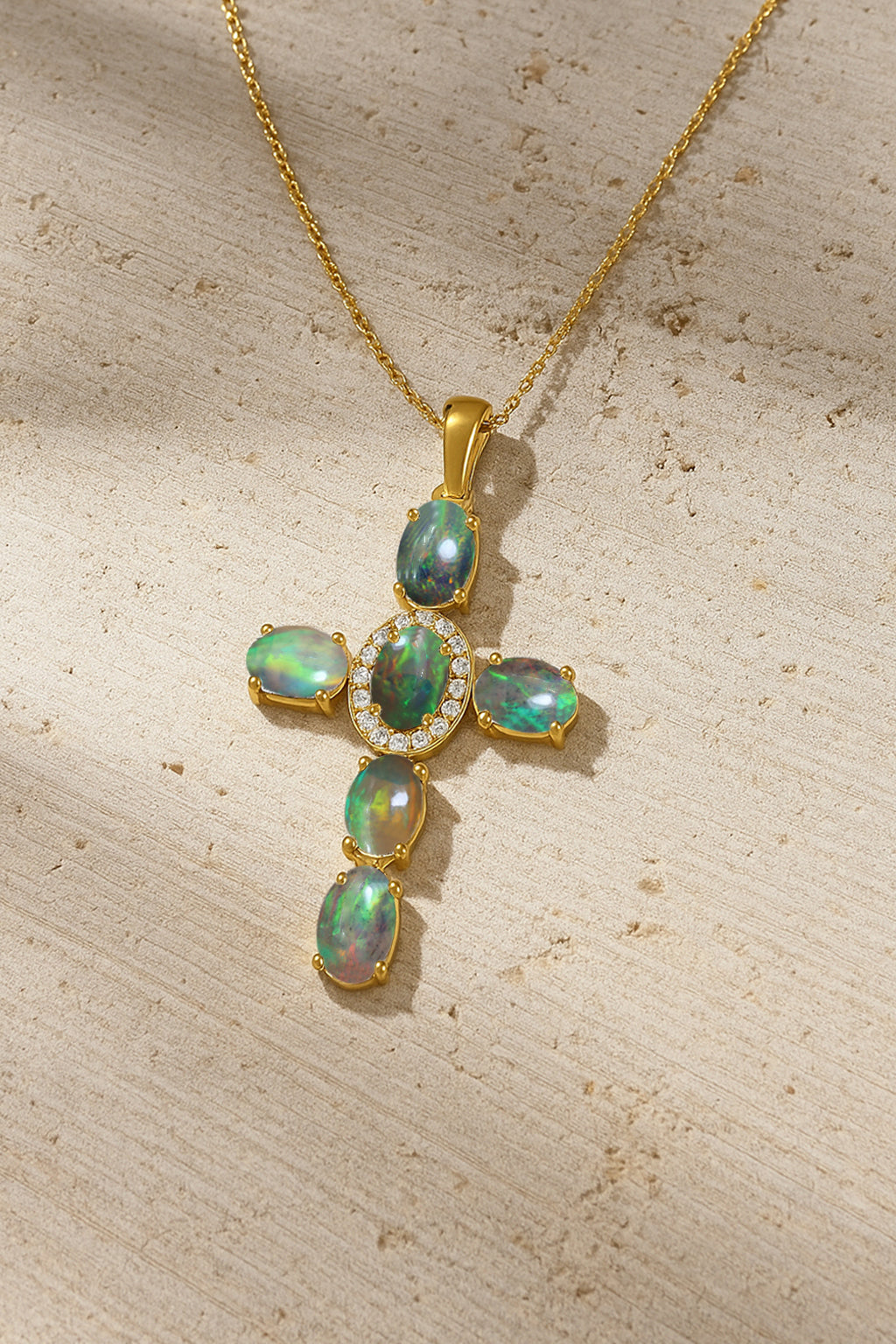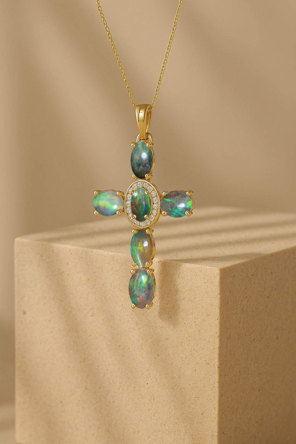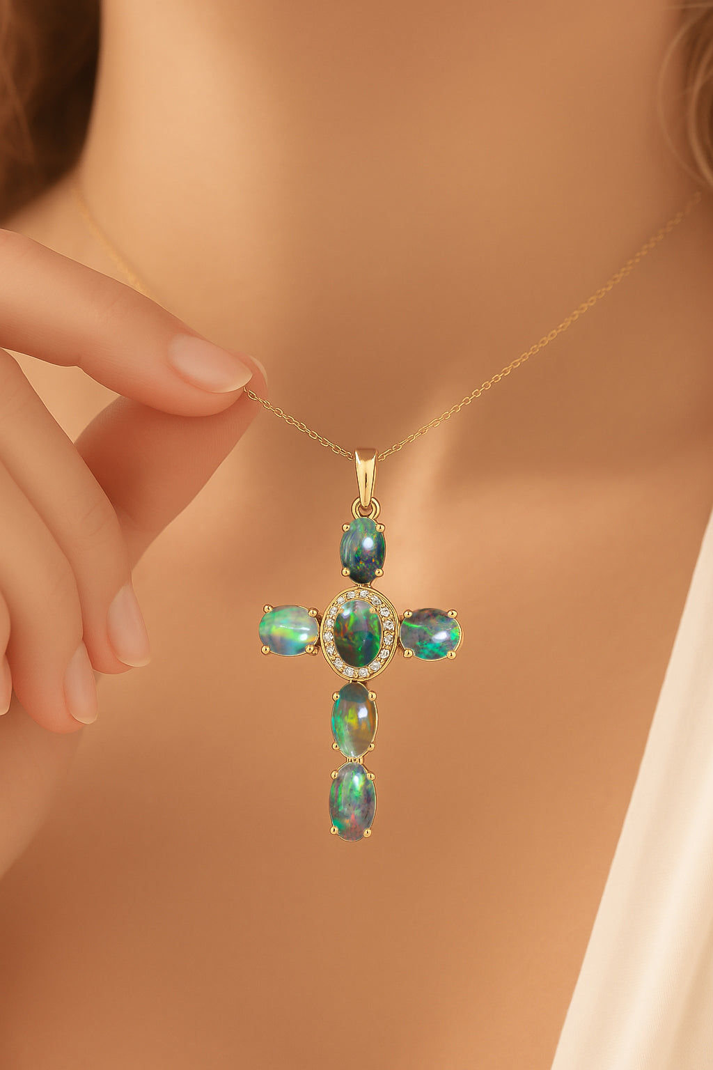 Black OpalElevate your spiritual style with this exquisite Black Opal Oval Holy Cross Pendant Necklace, beautifully crafted in 925 Sterling Silver for timeless elegance. Featuring a luminous 6x4 mm smooth oval Black Opal totaling 2.40 carats, the pendant showcases a radiant cross design measuring 34.19 x 19.98 mm, offering a graceful blend of devotion and sophistication. Suspended on a 16" + 2" adjustable cable chain with a secure lobster clasp, this 3.50 gm approx necklace is perfect for daily wear, gifting, or meaningful occasions. A luxurious statement piece for women who appreciate spiritual jewelry with a refined, modern touch.