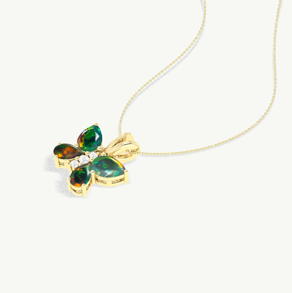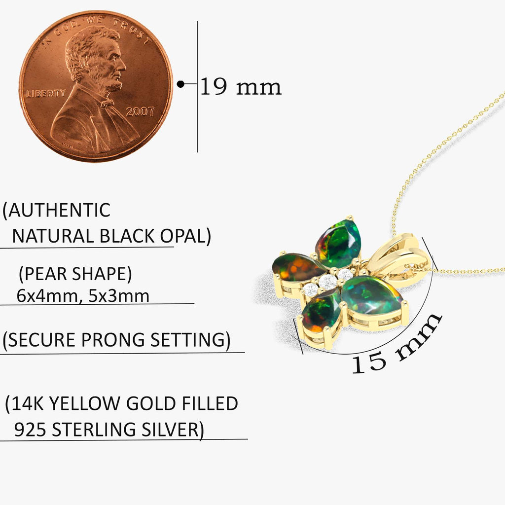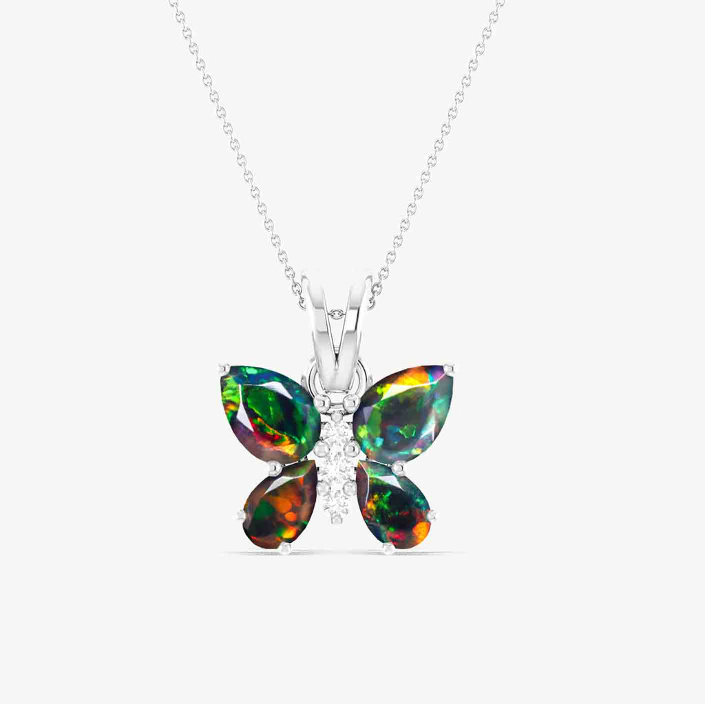 Black OpalAdd a touch of whimsical elegance with our Black Opal Butterfly Pendant Necklace, beautifully crafted in 925 sterling silver. This delicate pendant features 1.3 carats of luminous black opals, with two 6x4mm pear-shaped stones and two 5x3mm pear-shaped stones, forming a stunning butterfly design that symbolizes transformation, beauty, and grace. Perfect as a gift or a statement piece, this necklace blends playful charm with refined sophistication.