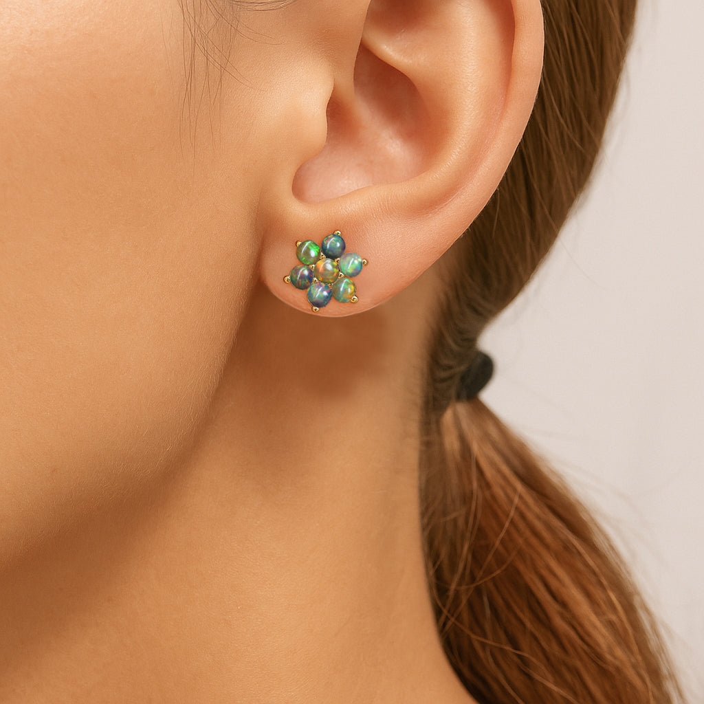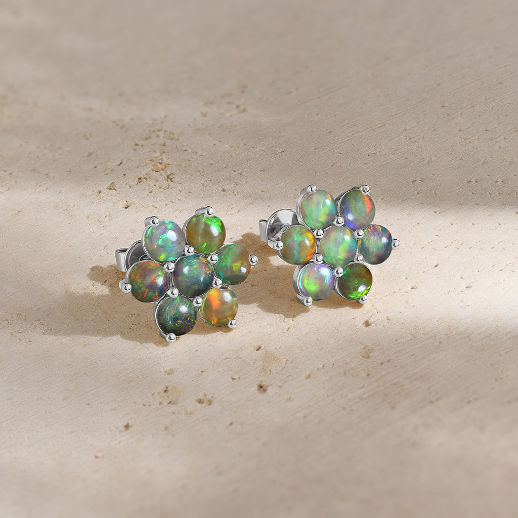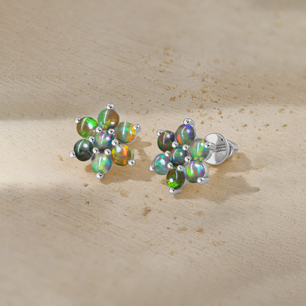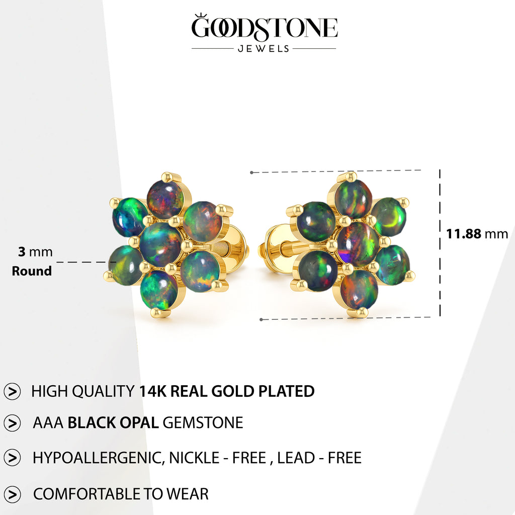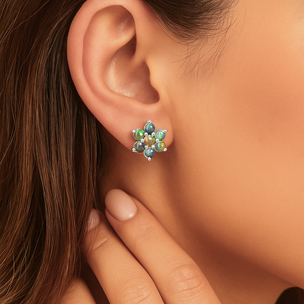 Black OpalElevate your everyday elegance with these Black Opal Round Stone Stud Earrings, beautifully crafted in 925 Sterling Silver. Featuring 14 smooth 3 mm round opal stones totaling 2.80 carats, each earring reflects a soft iridescent glow that enhances any look from casual chic to refined evening wear. With a size of 11.88 x 10.46 mm and a solid 3.60 gm build, these studs offer both durability and luxury. The high polish silver setting enhances the natural fire of the opal, making this pair a perfect gift for birthdays, anniversaries, or opal lovers. A timeless, luminous addition to your fine jewelry collection.