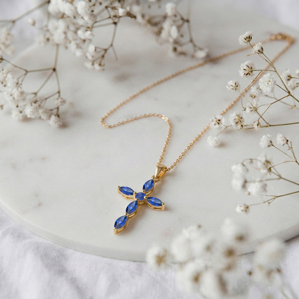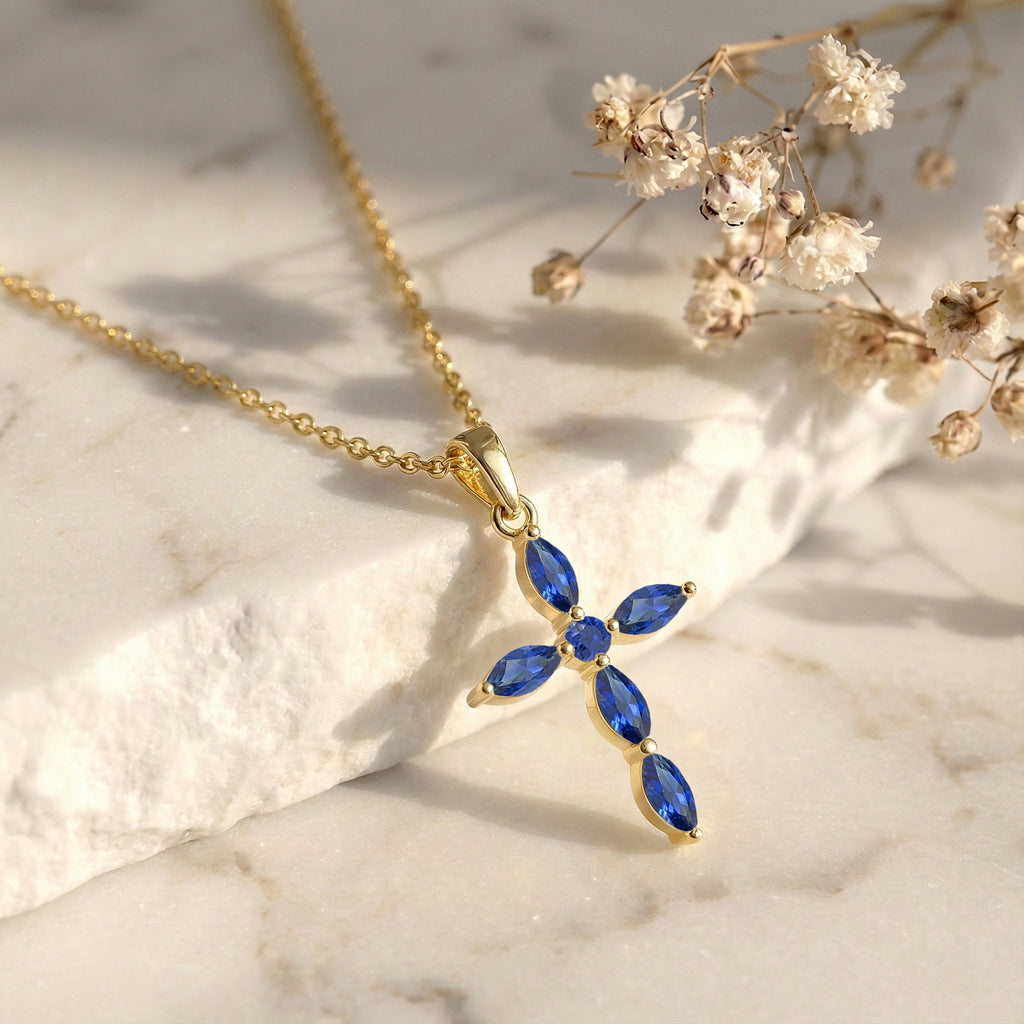 Elegant and timeless, this cross pendant necklace features five faceted marquise-cut blue sapphire gemstones (5 x 2.5 mm each) set in yellow gold plated brass. With a total carat weight of approximately 2 CT, the deep blue stones create a striking, sophisticated sparkle. The pendant measures 27.29 x 14.69 mm and hangs from a 16” + 2” adjustable cable chain with a secure lobster clasp. Lightweight and versatile, this necklace adds a refined touch to everyday wear or special occasions.