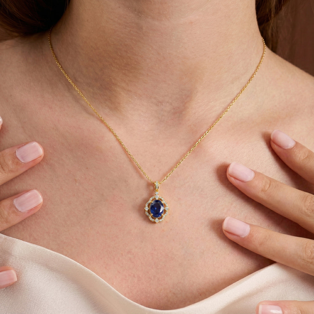 Capture timeless elegance with this Blue Sapphire Oval Halo Pendant Necklace. Featuring a 1.2ct faceted oval blue sapphire surrounded by sparkling CZ stones, the 25x12mm pendant is suspended from a 16"+2" yellow gold plated brass cable chain. Lightweight at 3.5g, it’s perfect for layering or wearing alone for a sophisticated look. Ideal for daily wear, special occasions, or gifting, this necklace adds a luxurious touch of deep blue brilliance to any jewelry collection.