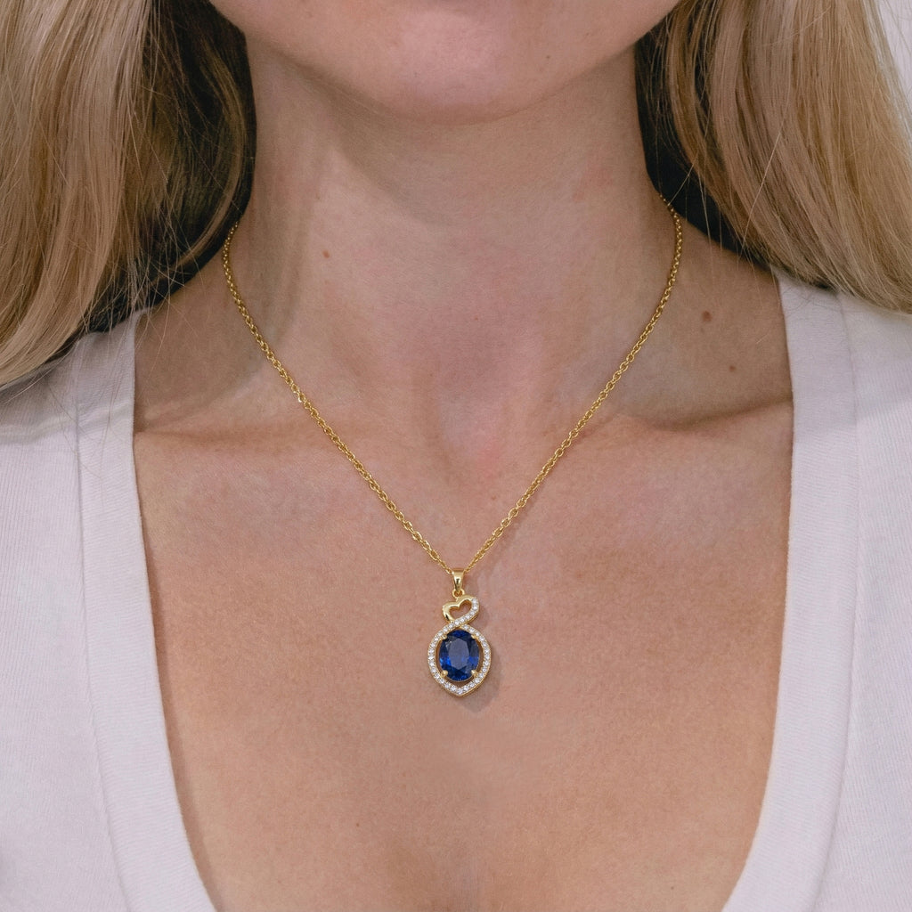 Elevate your elegance with this Blue Sapphire Oval Infinity Twist Heart Pendant Necklace in yellow gold plated brass. Featuring a stunning 1.2ct oval-cut blue sapphire (8x6 mm) with a brilliant faceted finish, this infinity heart design symbolizes love and loyalty. The pendant measures 24.55 x 11.64 mm and is suspended from a 16” + 2” adjustable cable chain with a secure lobster clasp. Lightweight at approximately 5 grams with chain, it’s perfect for everyday sophistication or as a meaningful gift for anniversaries and special moments.