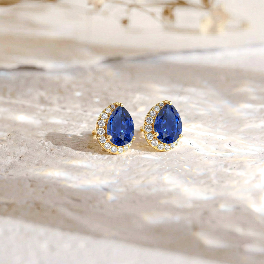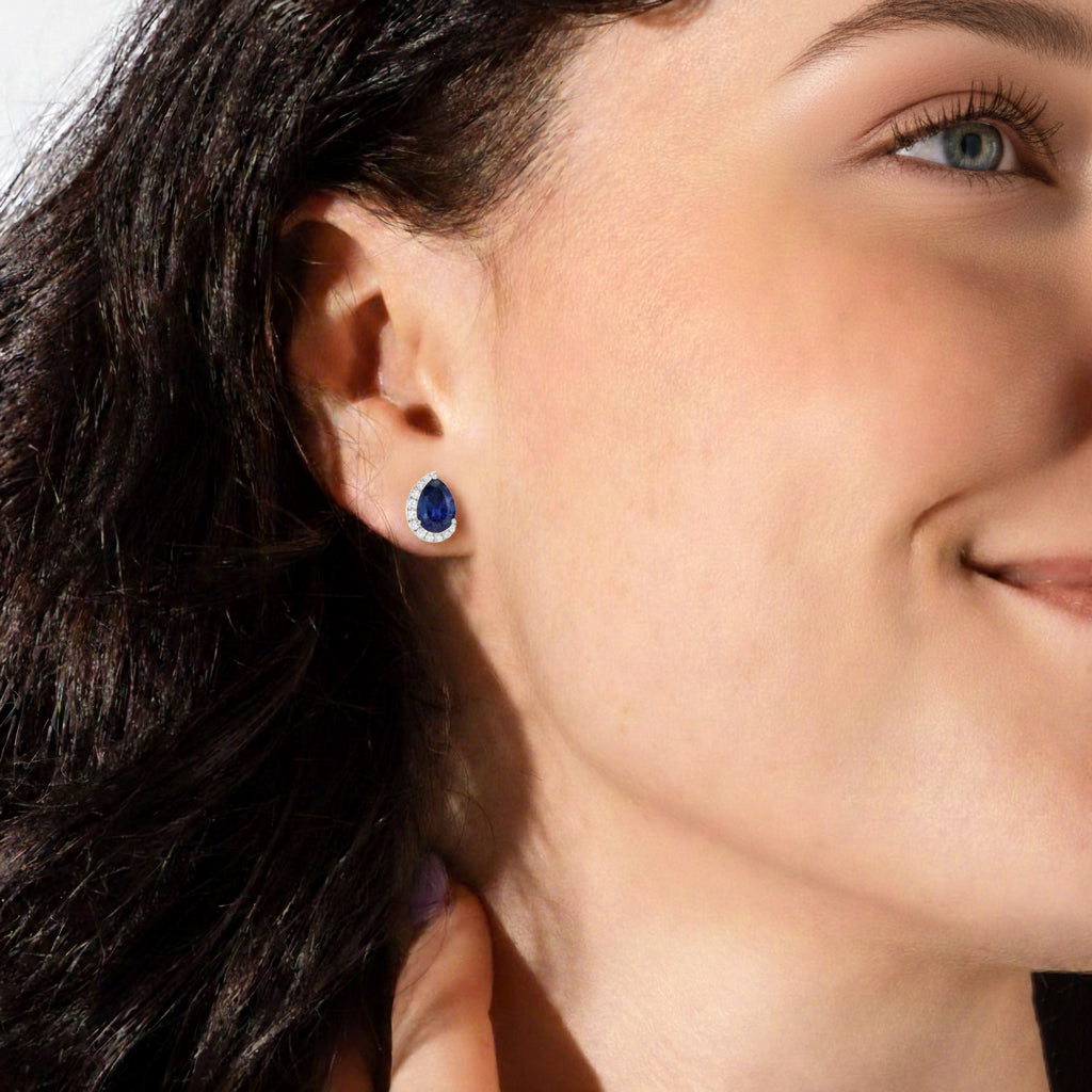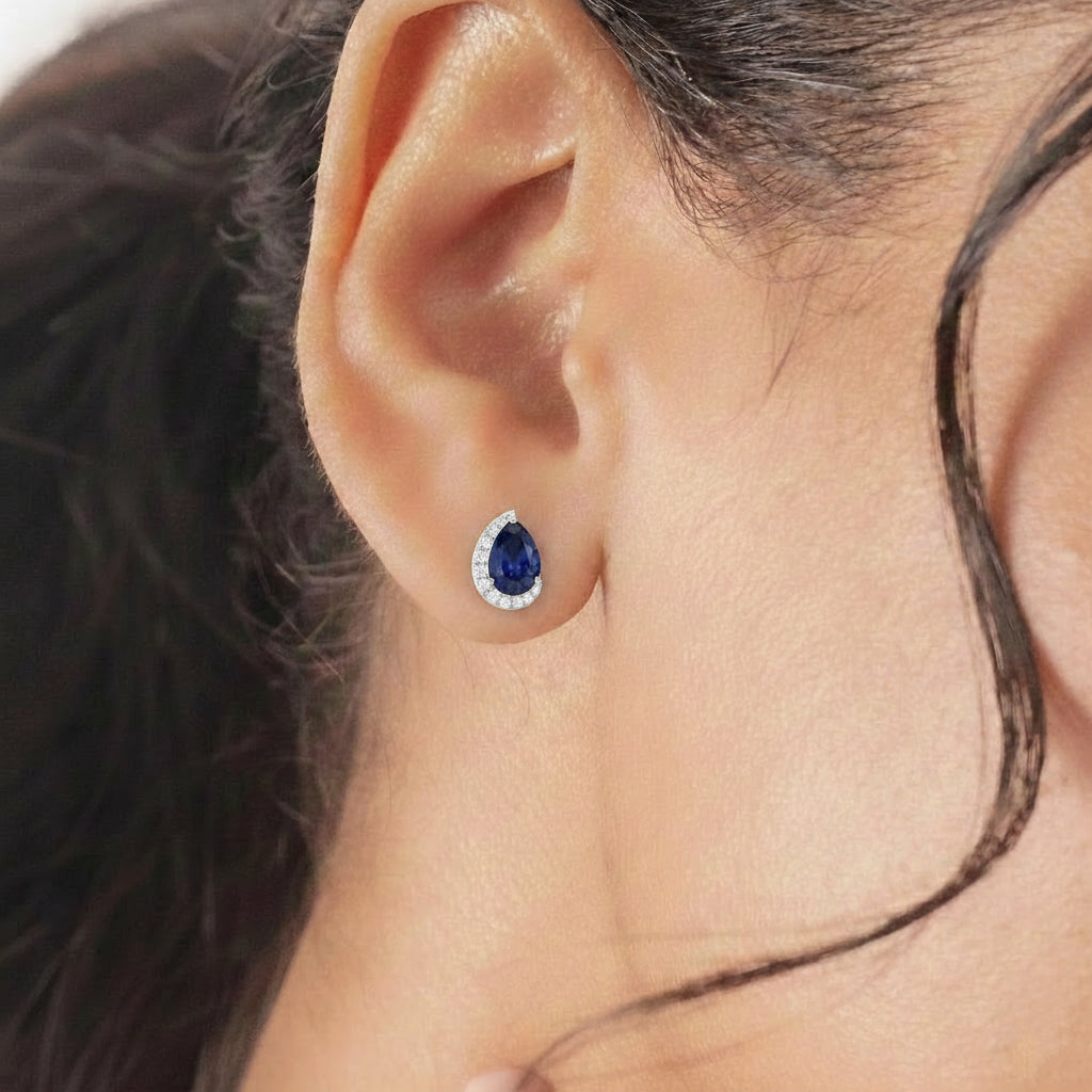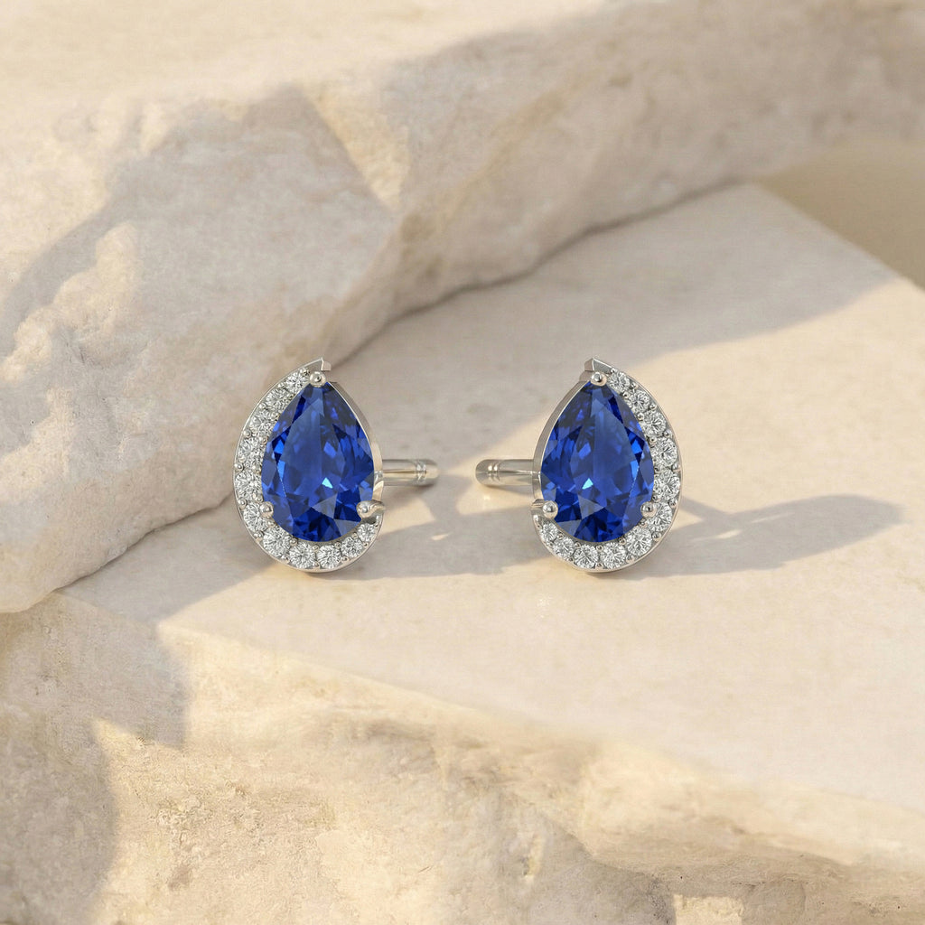 Blue Sapphire Pear Halo Stud Earrings in 925 Sterling Silver 1ct