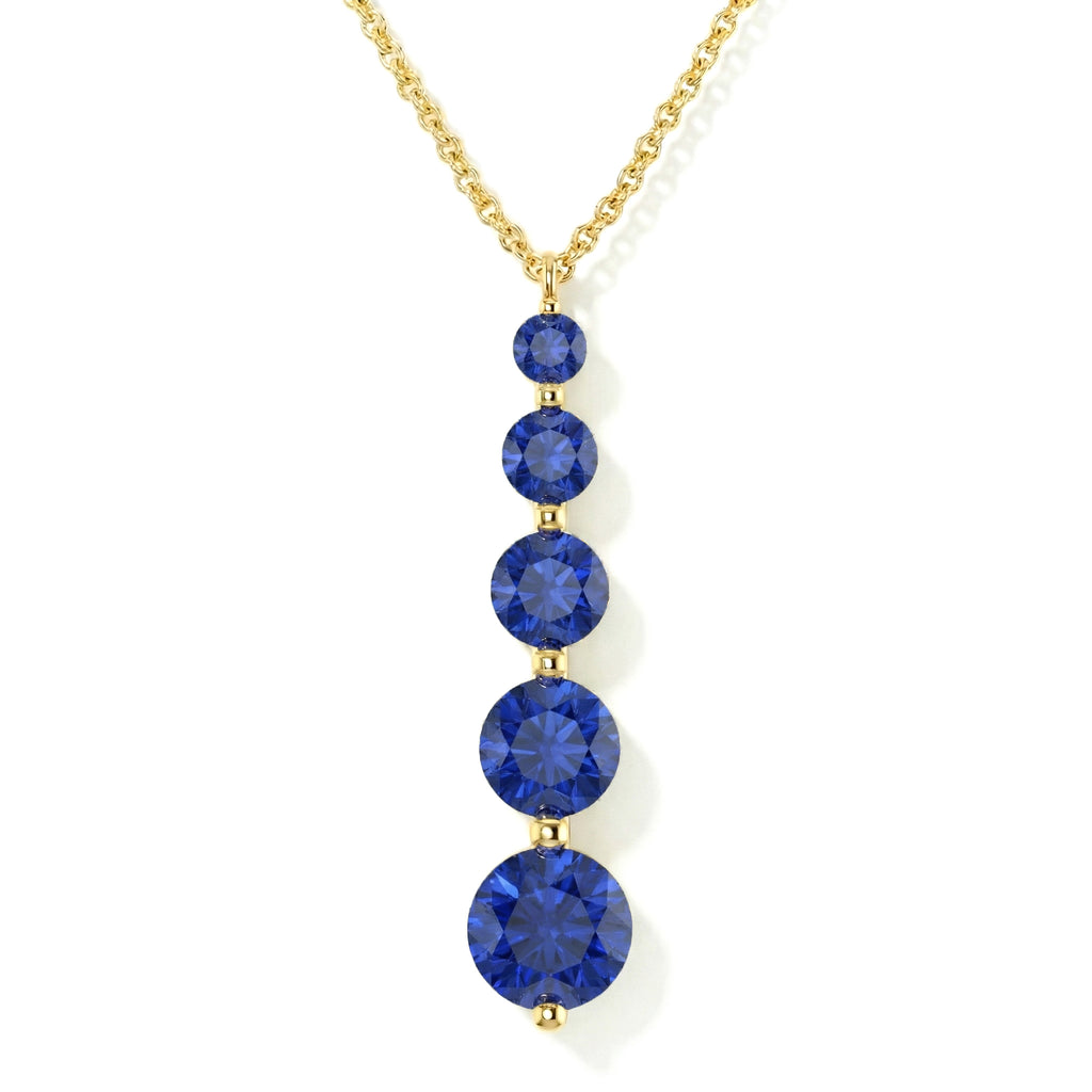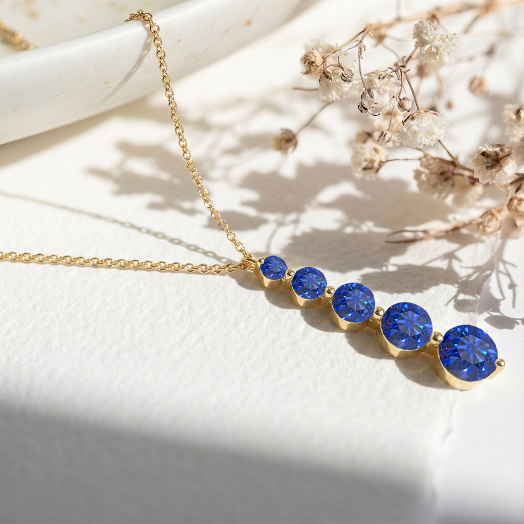 Add timeless sophistication with this Blue Sapphire Round 5-Stone Bar Pendant Necklace, crafted in yellow gold-plated brass. Featuring five faceted blue sapphires ranging from 3mm to 7mm (total 3.90 carats), the pendant measures 34.76 x 7.30 mm and hangs on a 16"+2" cable chain. Lightweight yet striking at 6.65g, it’s perfect for layering or wearing solo. Ideal as a birthstone jewelry gift or a classic statement piece, this necklace brings rich, vibrant sparkle to any outfit.