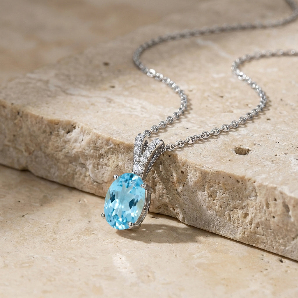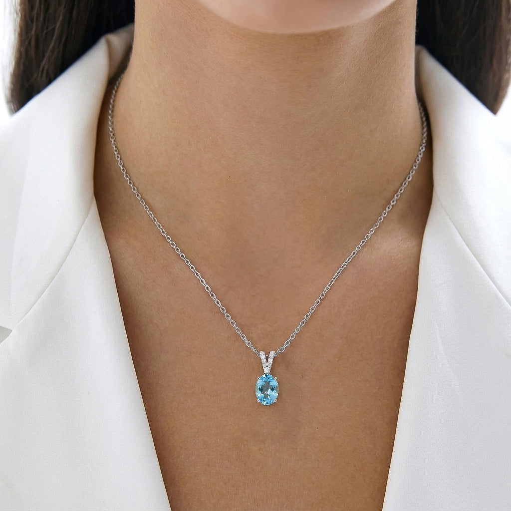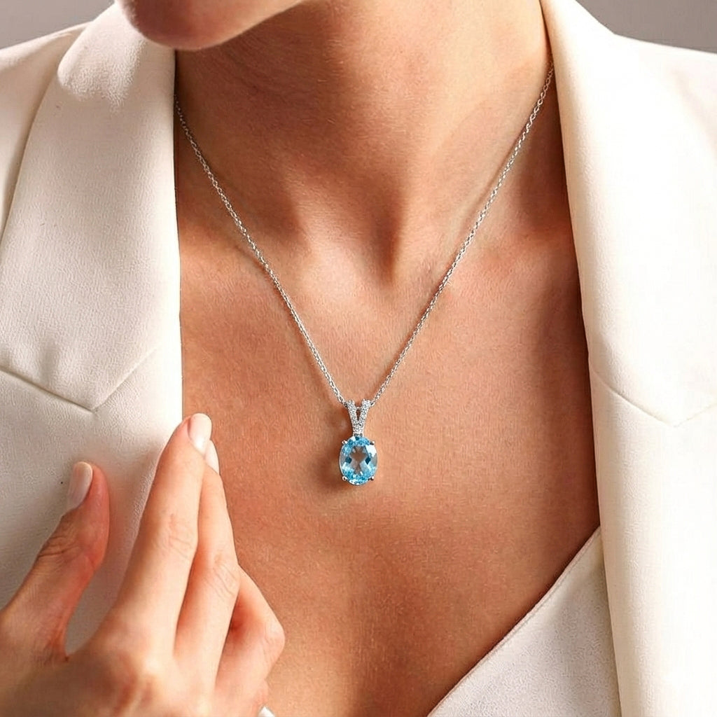Natural Blue Topaz Solitaire Pendant Necklace in 925 Sterling Silver features a radiant 1.2ct oval-cut blue topaz (8x6mm) with brilliant faceted sparkle. Crafted in a classic solitaire setting, the pendant measures 15.81 x 6.84mm and hangs gracefully from a 16” + 2” adjustable cable chain with a secure lobster clasp. Made from premium sterling silver, this elegant blue topaz necklace offers refreshing color, timeless style, and everyday comfort—perfect for gifting or adding sophistication to any look.