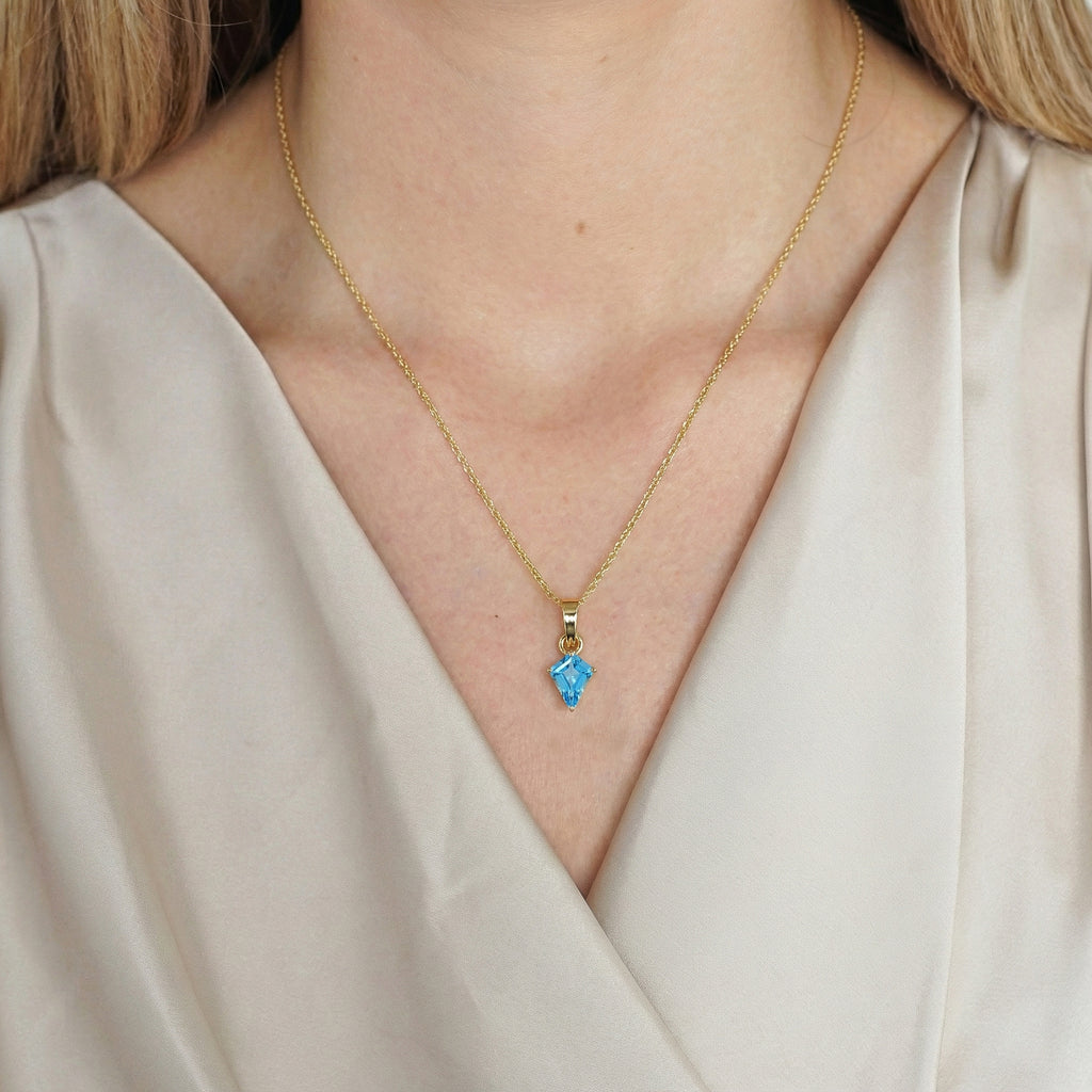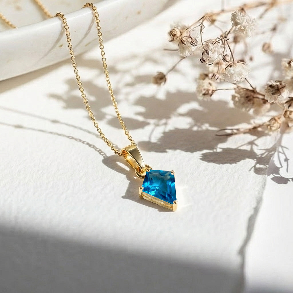Add vibrant elegance to your collection with this Blue Topaz Kite Solitaire Pendant Necklace in yellow gold-plated brass. Featuring a 1.40 ct, 9×7 mm kite-cut blue topaz, the pendant measures 18.20 × 7.40 mm and is beautifully faceted for brilliant sparkle. It hangs from a 16"+2" adjustable cable chain with a secure lobster clasp. Lightweight at 3.7 grams with chain, this necklace is perfect for everyday wear, layering, or gifting a timeless blue topaz jewelry piece.