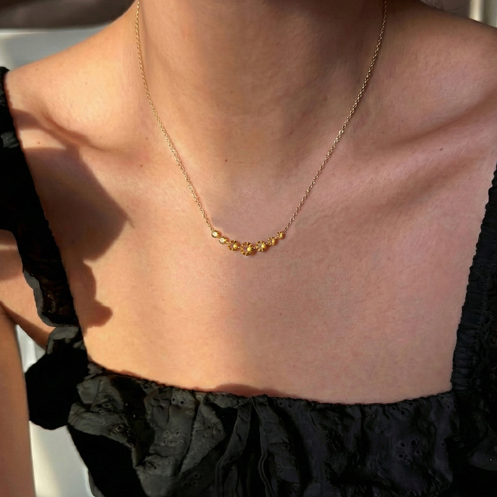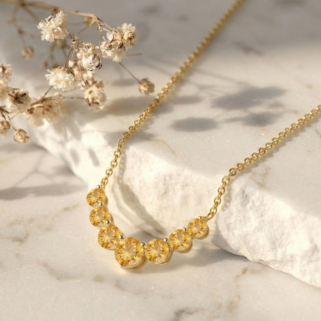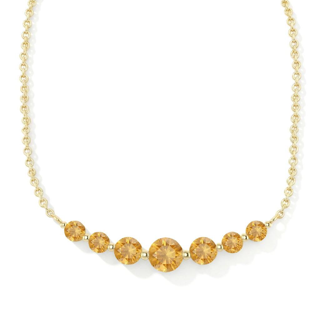 Brighten your look with this Natural Citrine Curved Bar Pendant Necklace, crafted in yellow gold-plated brass. Featuring round faceted citrines in sizes 5mm, 4mm, and 3mm, totaling approximately 2.55 carats, the curved bar pendant measures 33.50 mm and hangs on a 16"+2" cable chain. Lightweight at 4.15g, it’s perfect for layering or wearing solo. Ideal as a birthstone jewelry gift or a modern statement piece, this necklace adds sparkling golden brilliance and elegant charm to any outfit.