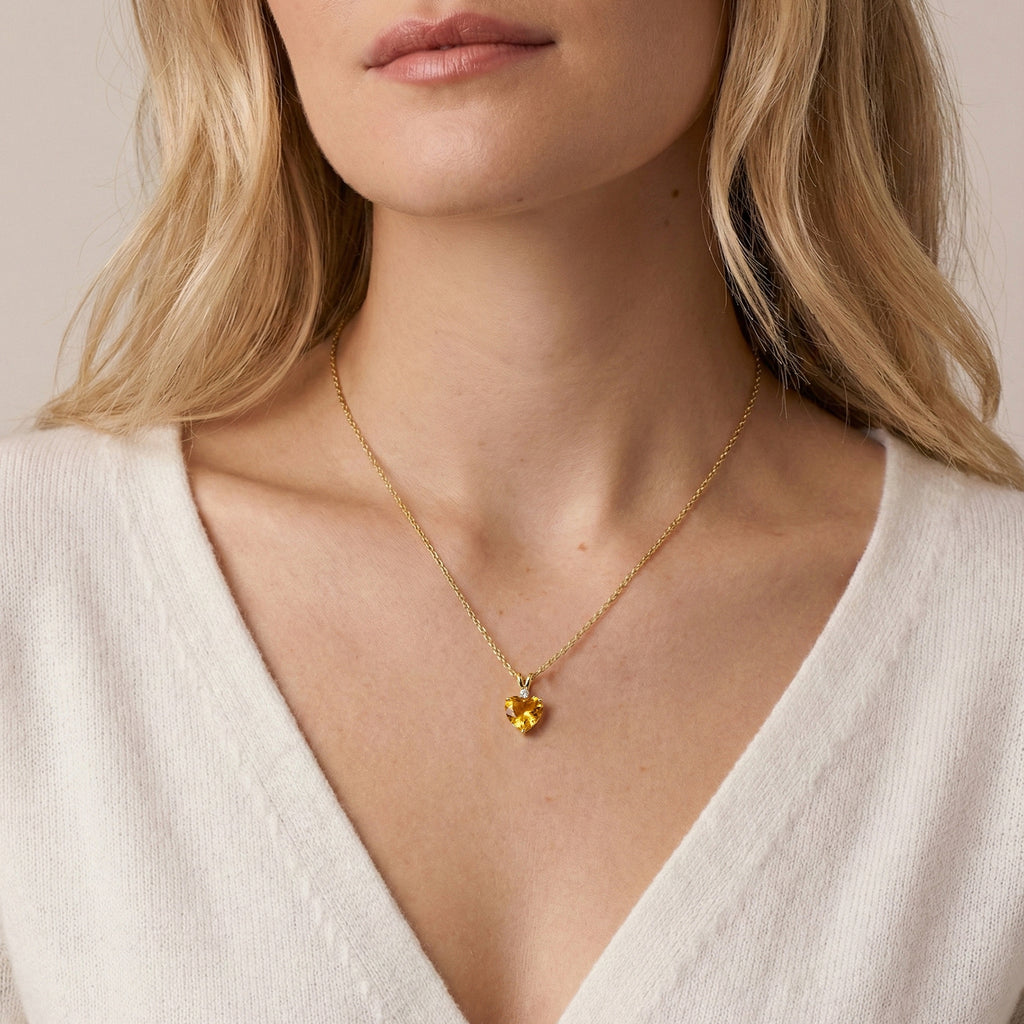 Radiate warmth with this 1.5ct citrine heart pendant necklace. Featuring a 7mm faceted citrine set in yellow gold plated brass, the 12.5x7mm heart charm hangs on a 16"+2" adjustable cable chain. Lightweight at approximately 3.5g, it’s perfect for daily wear or special occasions. This sparkling citrine jewelry piece makes a thoughtful gift and adds a vibrant, sunny touch to any outfit.
