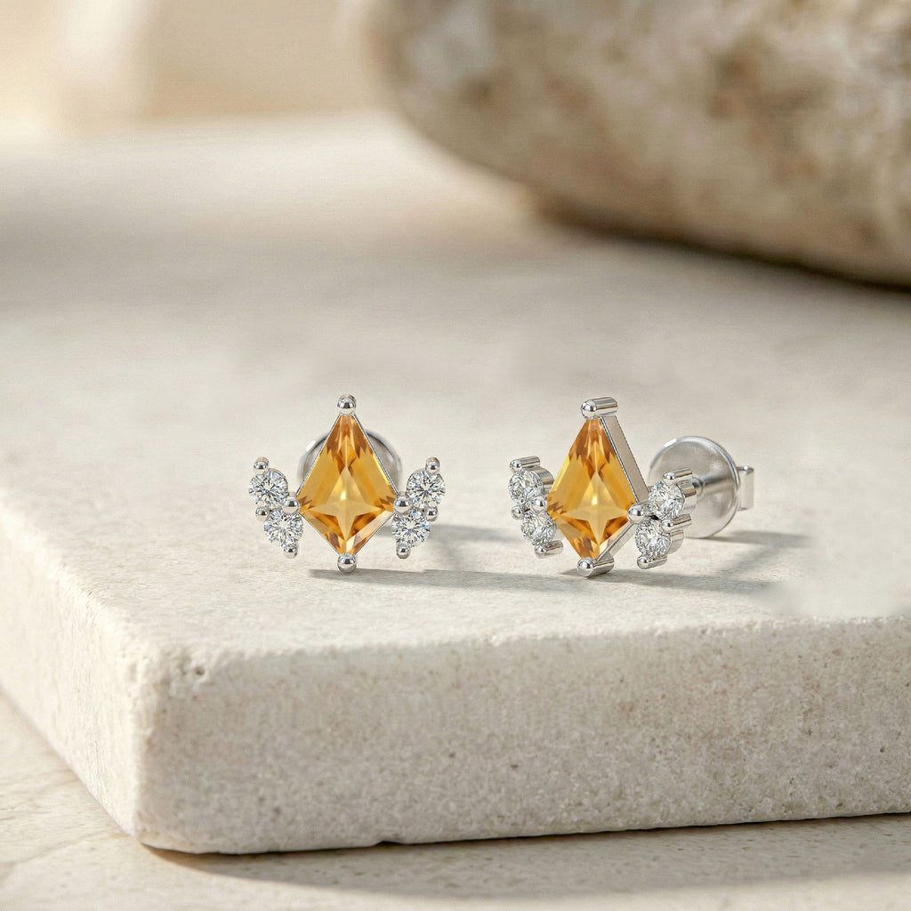 Crafted in solid 925 sterling silver, these Natural Citrine Kite Stud Earrings showcase two 6x4 MM faceted kite-cut stones totaling approximately 1 CT. The rich golden-yellow citrine symbolizes joy and positivity. Sized at 7.83 x 6.86 MM and weighing 1.05 grams, these studs provide secure and comfortable wear for any occasion.