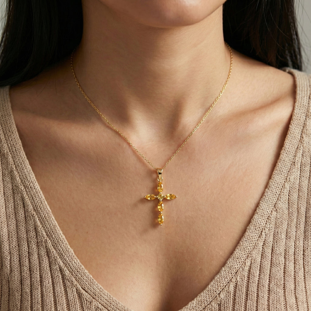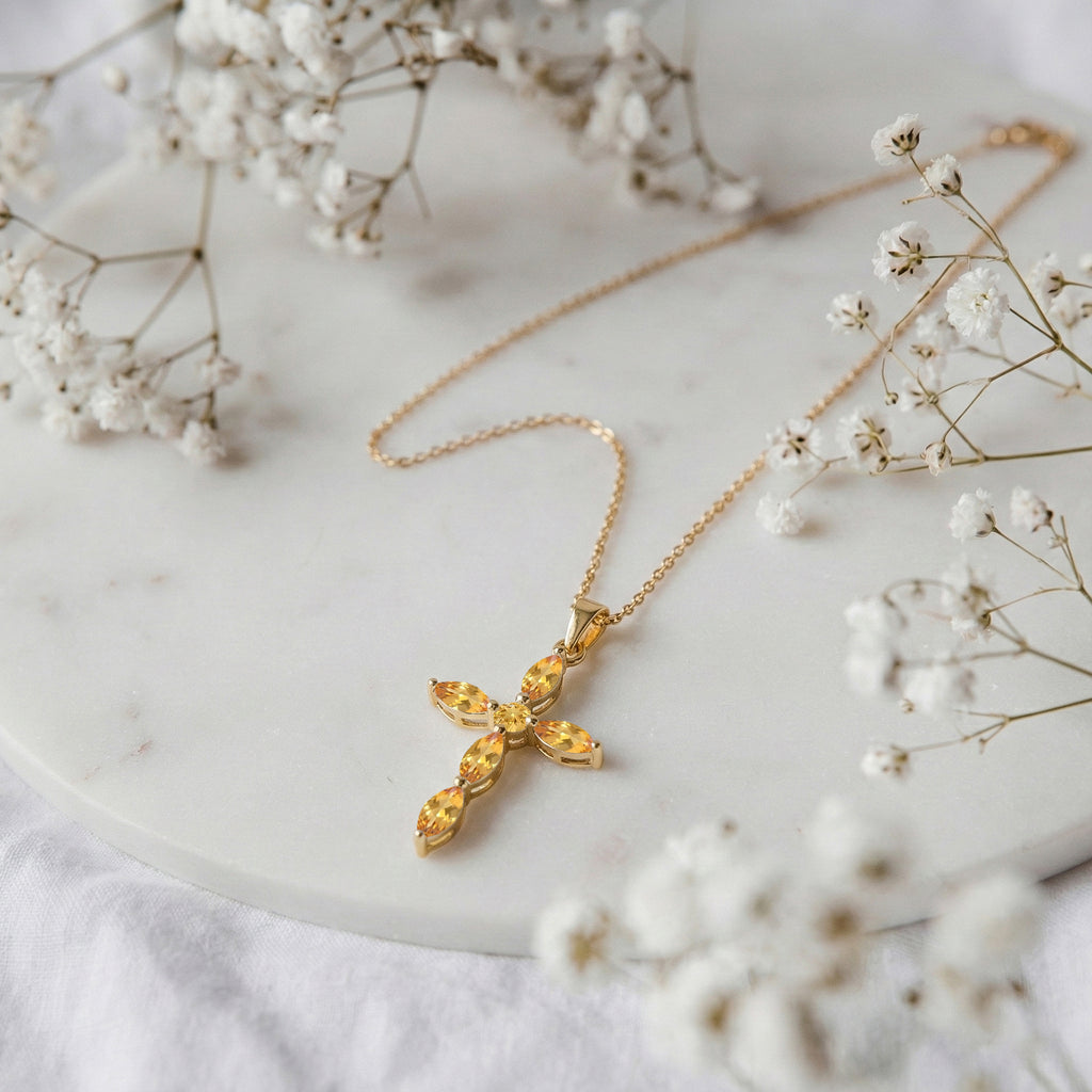Radiant and elegant, this cross pendant necklace features five faceted marquise-cut citrine gemstones (5 x 2.5 mm each) set in yellow gold plated brass. With a total carat weight of approximately 2 CT, the warm golden stones create a luminous, sparkling effect. The pendant measures 27.29 x 14.69 mm and hangs from a 16” + 2” adjustable cable chain with a secure lobster clasp. Lightweight and timeless, this necklace adds a sunny, sophisticated touch to everyday or special-occasion looks.