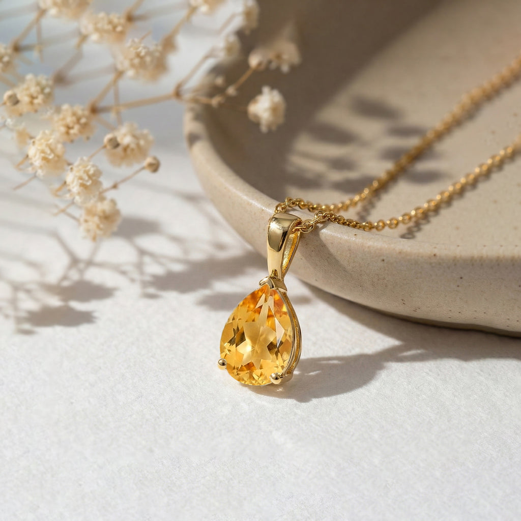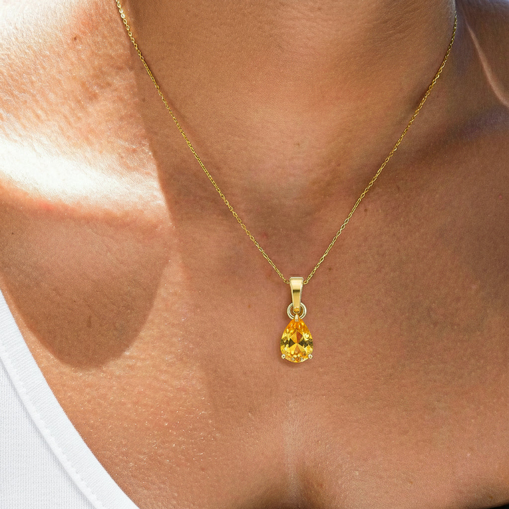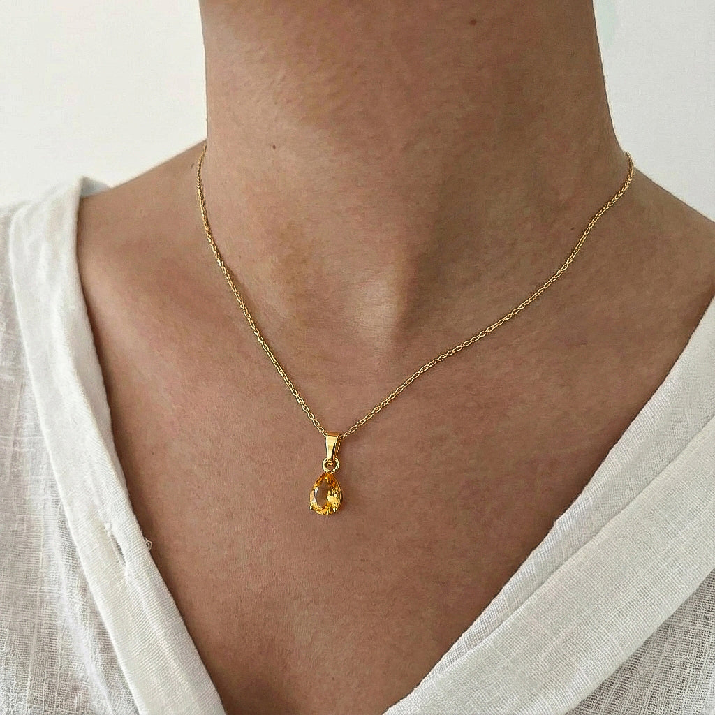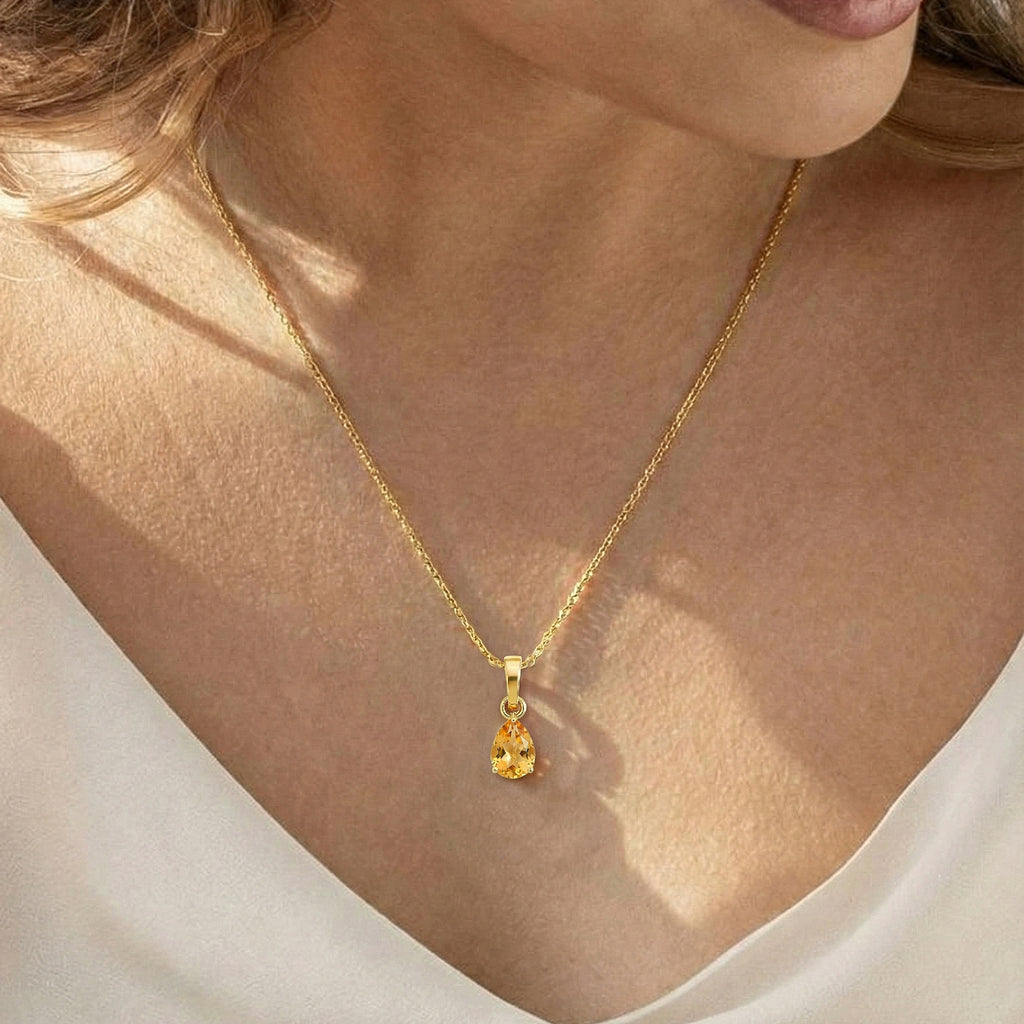 Radiate warmth and elegance with this Natural Citrine Pear Solitaire Teardrop Pendant Necklace. Featuring a faceted 9x7 mm pear-shaped citrine (approx. 1.4 carats), this stunning pendant is set in yellow gold plated brass for a polished, luxurious finish. Measuring 18.40 x 7 mm, the teardrop hangs gracefully from a 16” + 2” adjustable cable chain with a secure lobster clasp. A timeless accessory perfect for everyday wear or gifting to someone special.