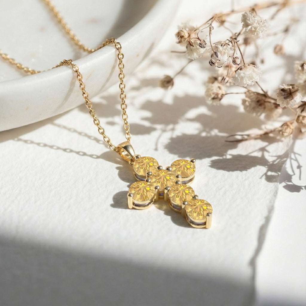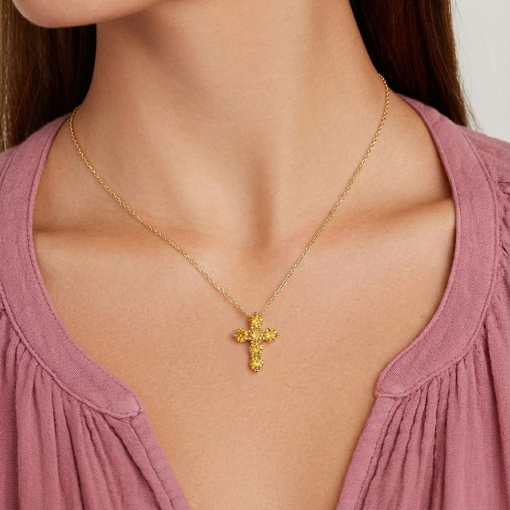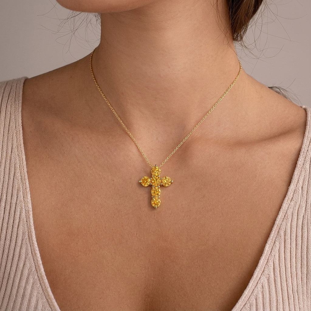 Warm and radiant, this cross pendant necklace features six faceted round Natural citrine gemstones (5 mm each) set in yellow gold plated brass. With a total carat weight of approximately 3.90 CT, the golden-yellow stones create a sparkling, luminous effect. The pendant measures 23.72 x 18.04 mm and hangs from a 16” + 2” adjustable cable chain with a secure lobster clasp. Weighing 7.50 gm with chain, this necklace is perfect for adding elegance to everyday wear or special occasions.