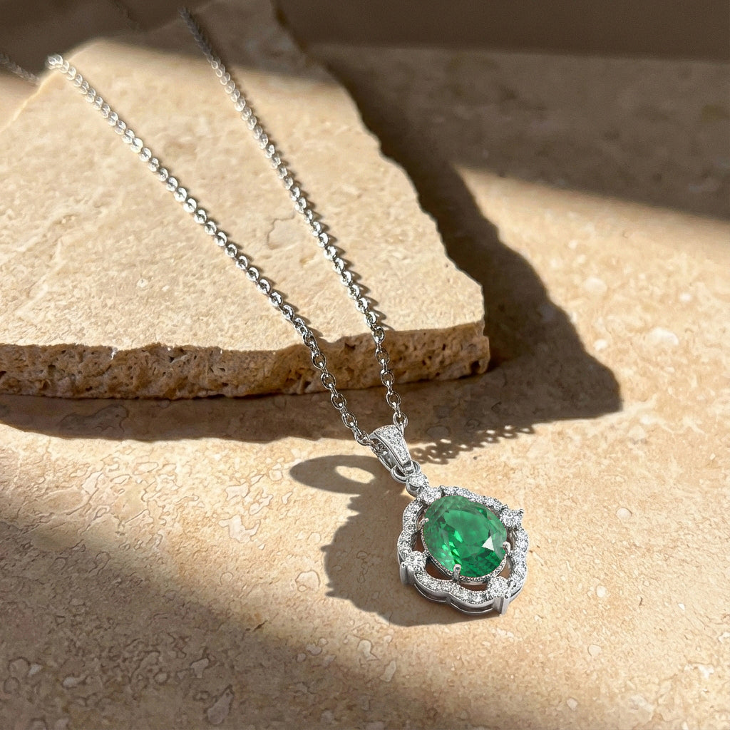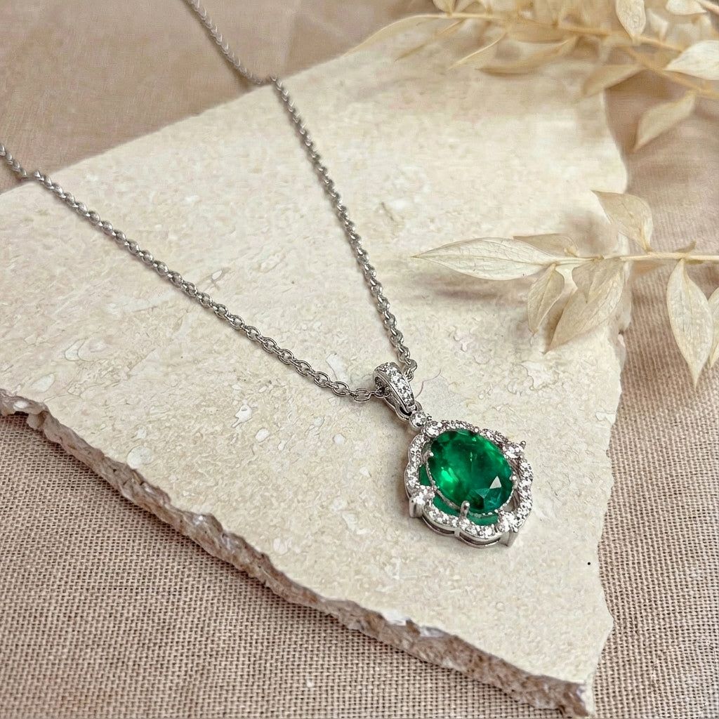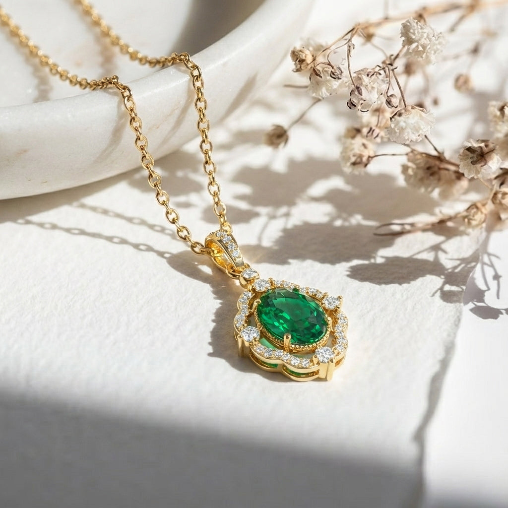Add a touch of luxury with our Emerald Oval Halo Pendant Necklace in 925 sterling silver. Featuring a 1.2ct faceted emerald (8x6mm) surrounded by sparkling CZ stones, this 25x12mm pendant hangs elegantly on a 16” + 2” adjustable cable chain. Lightweight at approximately 3.5g, it’s perfect for everyday wear or special occasions. A timeless, handcrafted piece that combines natural beauty with American craftsmanship—ideal for gifting or enhancing your jewelry collection with sophisticated elegance.