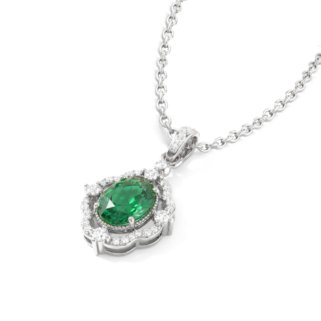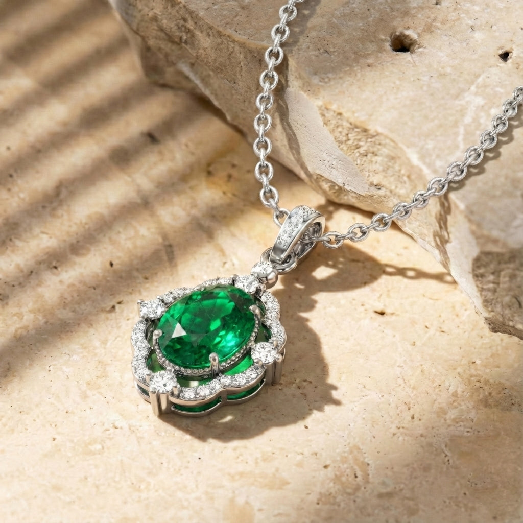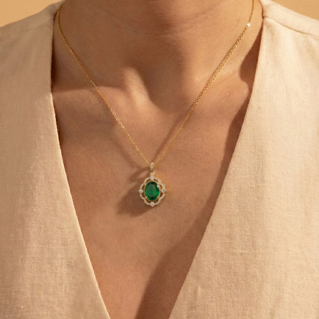 Add a touch of luxury with our Emerald Oval Halo Pendant Necklace in 925 sterling silver. Featuring a 1.2ct faceted emerald (8x6mm) surrounded by sparkling CZ stones, this 25x12mm pendant hangs elegantly on a 16” + 2” adjustable cable chain. Lightweight at approximately 3.5g, it’s perfect for everyday wear or special occasions. A timeless, handcrafted piece that combines natural beauty with American craftsmanship—ideal for gifting or enhancing your jewelry collection with sophisticated elegance.