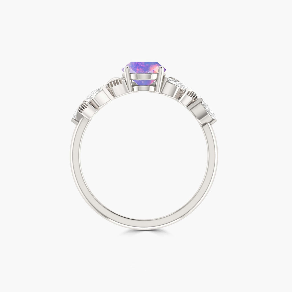 Lavender OpalNatural Lavender Opal Designer Leaf Ring for Women, featuring a genuine 8x6MM oval faceted Lavender opal. This mesmerizing gemstone showcases an iridescent play of colors that captivates at every glance, making it a standout piece for any jewelry lover. Designed in 925 sterling silver, the ring features an intricate leaf pattern that adds a touch of nature-inspired beauty and sophistication. The combination of artisan craftsmanship and luxurious finish ensures both quality and visual appeal. This ring is an excellent choice for women who appreciate both style and symbolism.