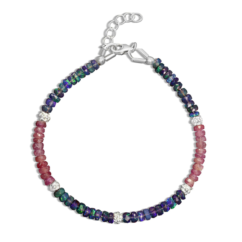 Black OpalThe GOODSTONE JEWELS Natural Black Opal & Ruby Bracelet for Women, a beautifully handcrafted piece designed to celebrate the powerful symbolism of dual birthstones. Featuring natural black opal, the October birthstone and vibrant ruby, the birthstone of July, this bracelet captures the essence of love, mystery, and passion. Expertly crafted in 925 sterling silver with yellow gold fill, the bracelet showcases 3x5 mm rondelle beads with a dual-stone face, separated by shimmering accents that enhance its brilliance. A lobster claw clasp and a 1-inch extender chain ensure a secure and adjustable fit, perfect for everyday wear or special occasions. Whether you're celebrating a birthday, anniversary, or simply showing appreciation, this birthstone bracelet makes an unforgettable gift for a wife, mother, sister, or friend. Its timeless design and symbolic meaning add sophistication to both casual and formal outfits.