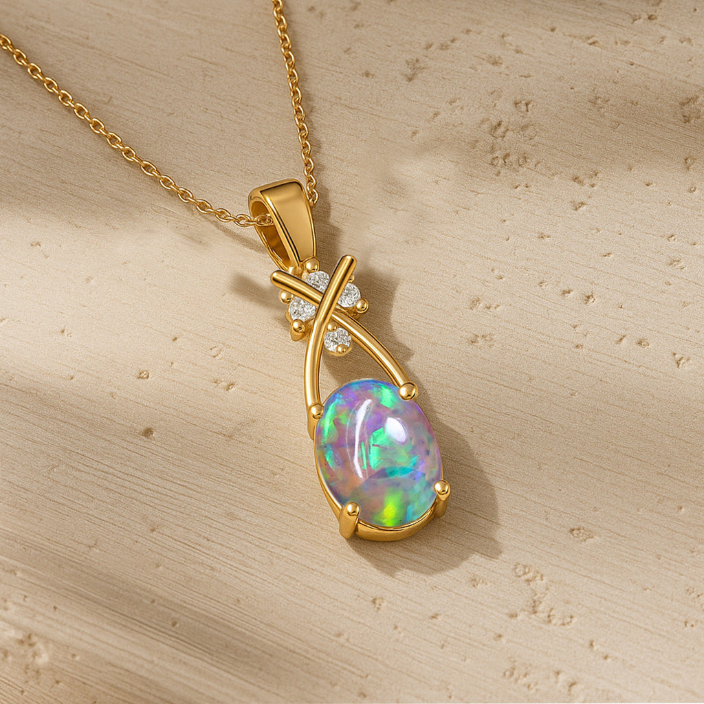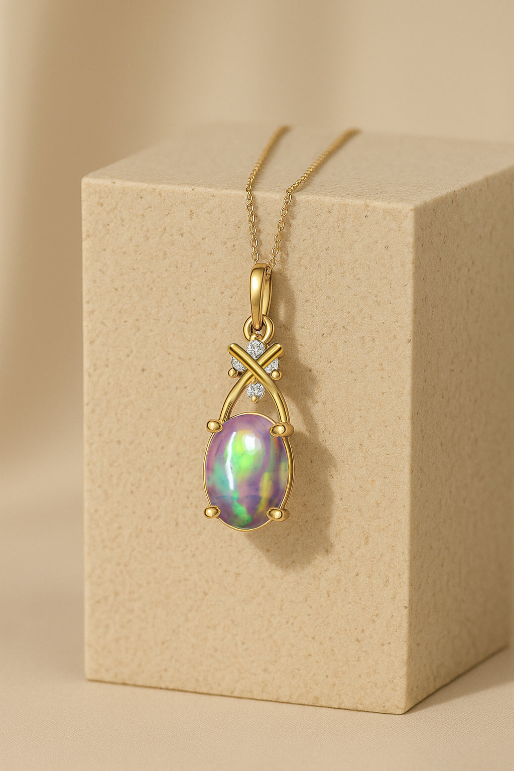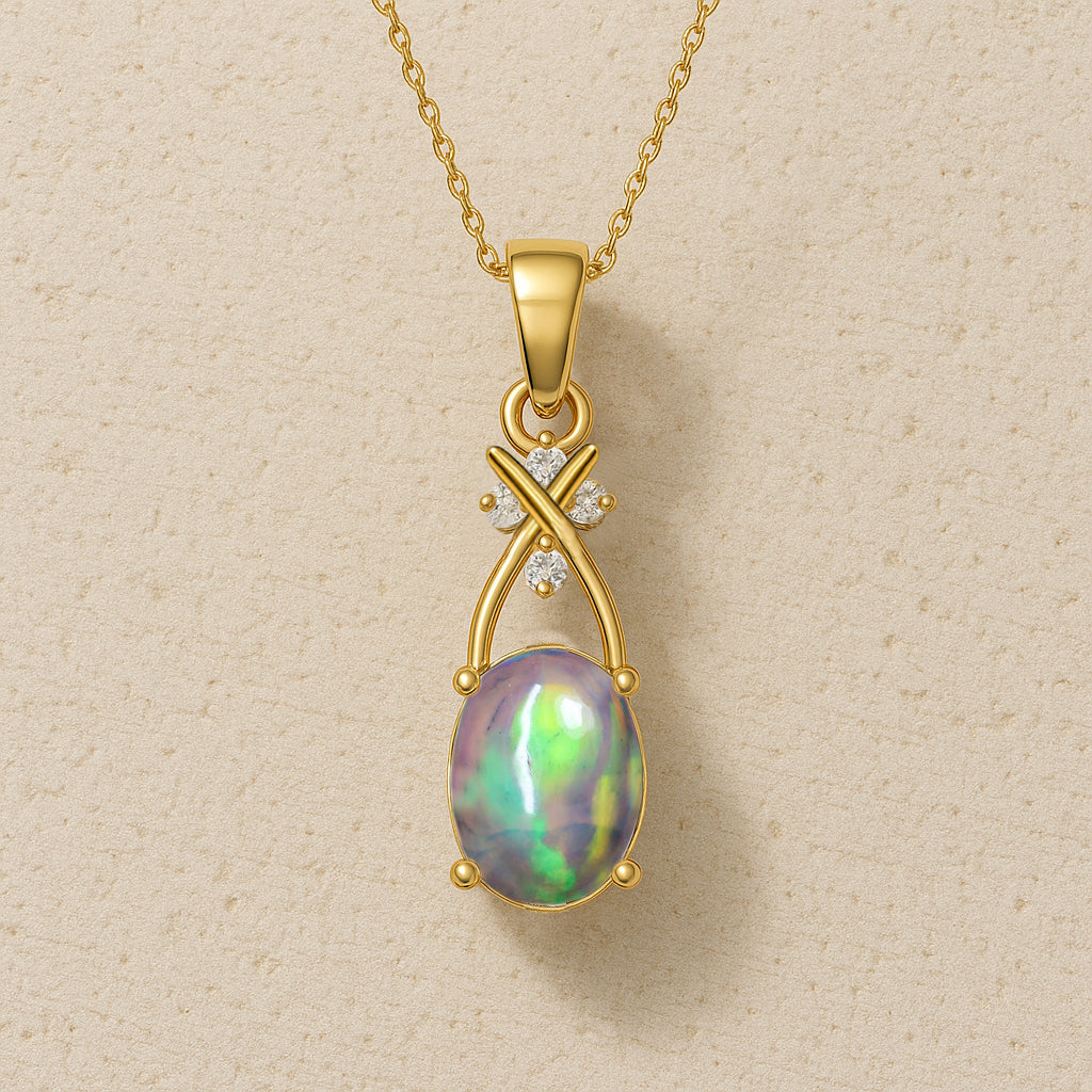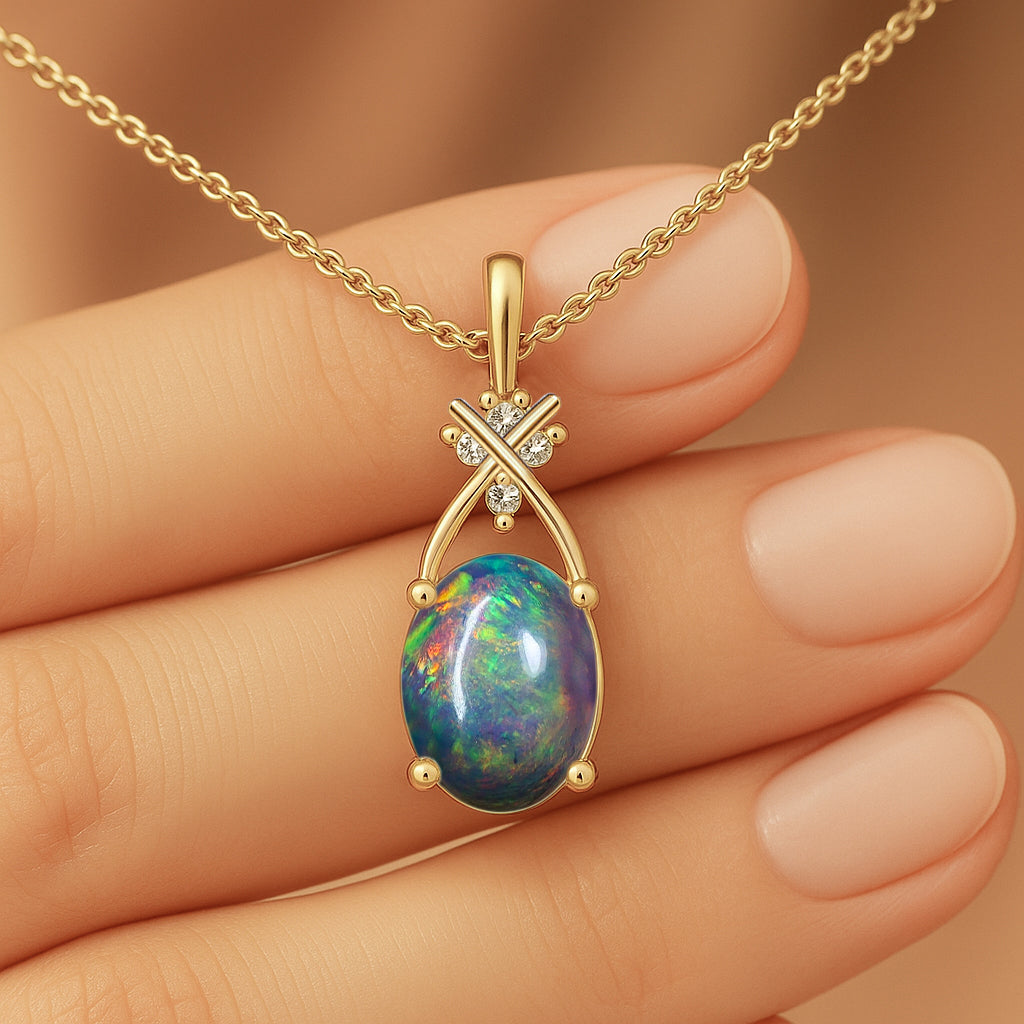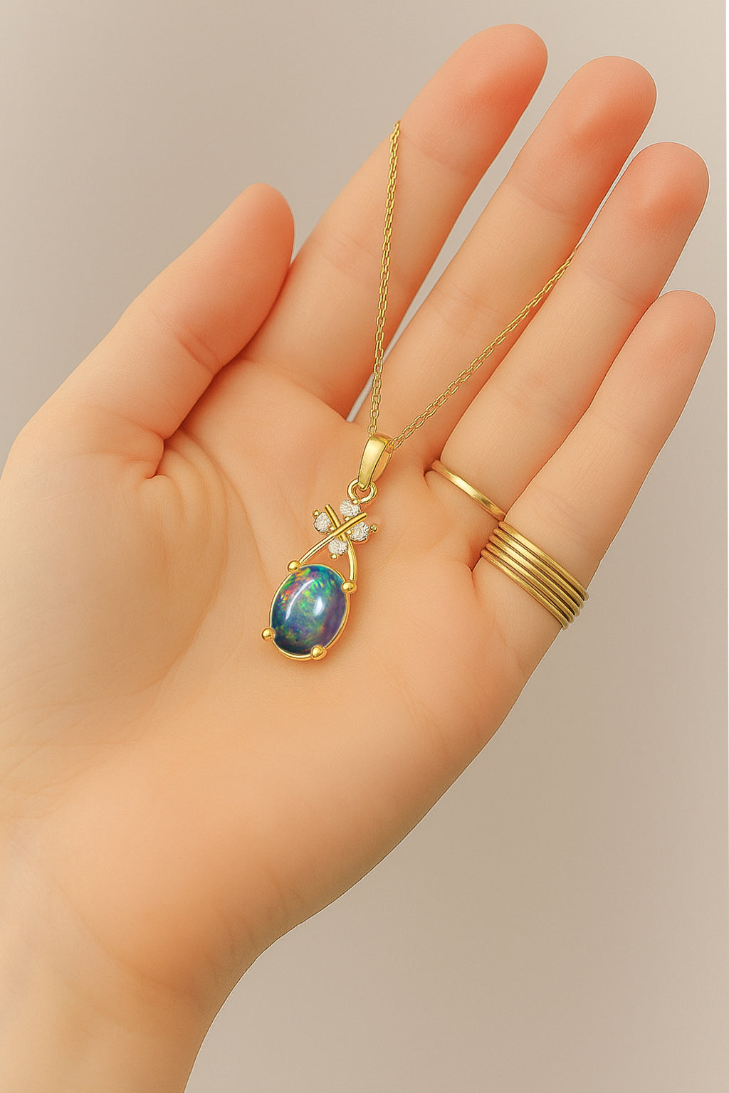 Black OpalElevate your everyday style with this exquisite Black Opal Oval Pendant Necklace, expertly crafted in 925 Sterling Silver. Featuring a luminous 9x7 mm smooth oval Opal (1.20 Ct), its natural iridescence creates a captivating play of colors that enhances any look. The elegant pendant measures 20.38 x 7.02 mm and is paired with a refined 16” + 2” adjustable cable chain secured with a lobster clasp for lasting comfort and durability. Lightweight at approximately 1.35 gm, this Opal necklace is perfect for gifting or adding a touch of luxury to your jewelry collection.