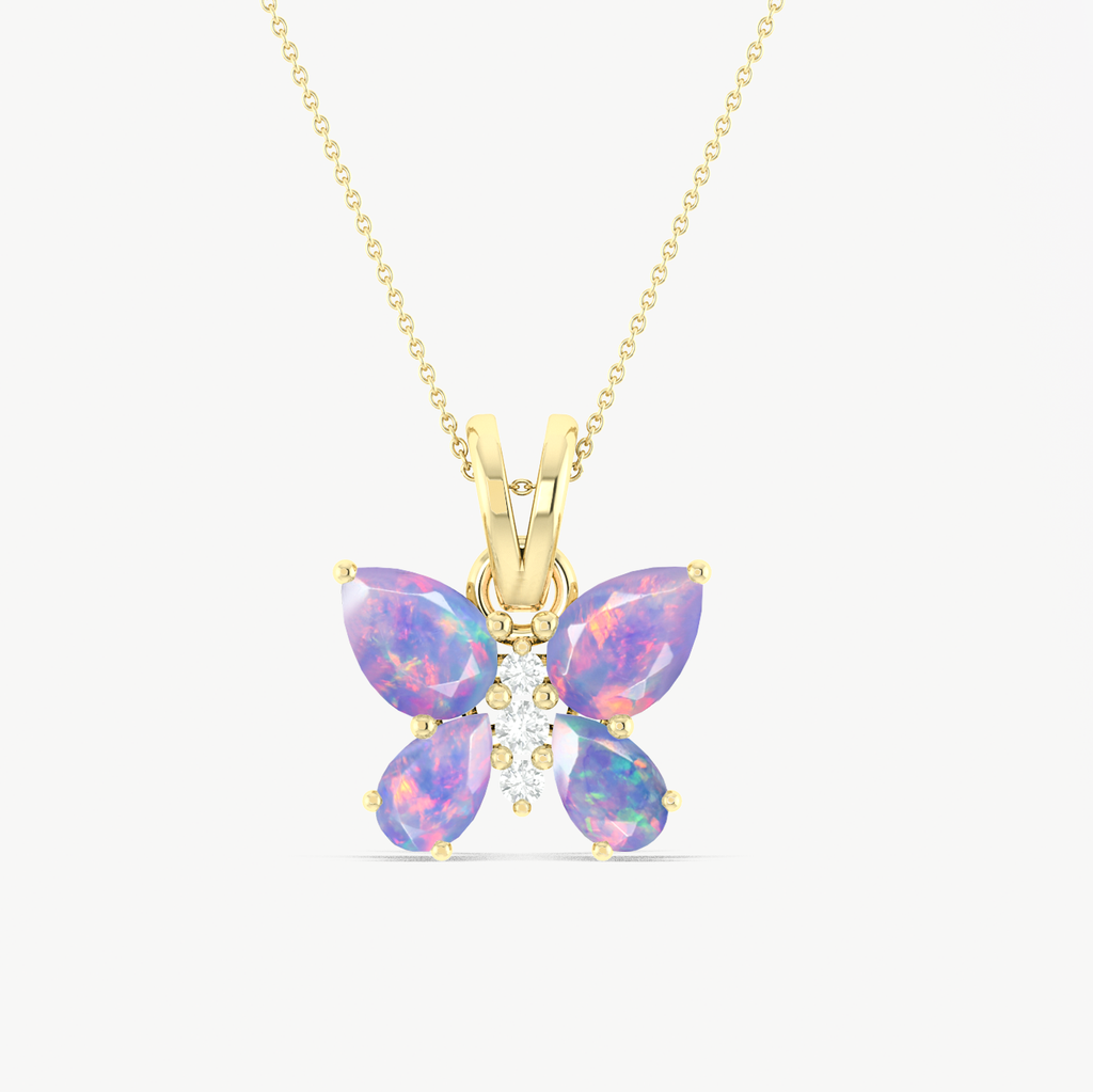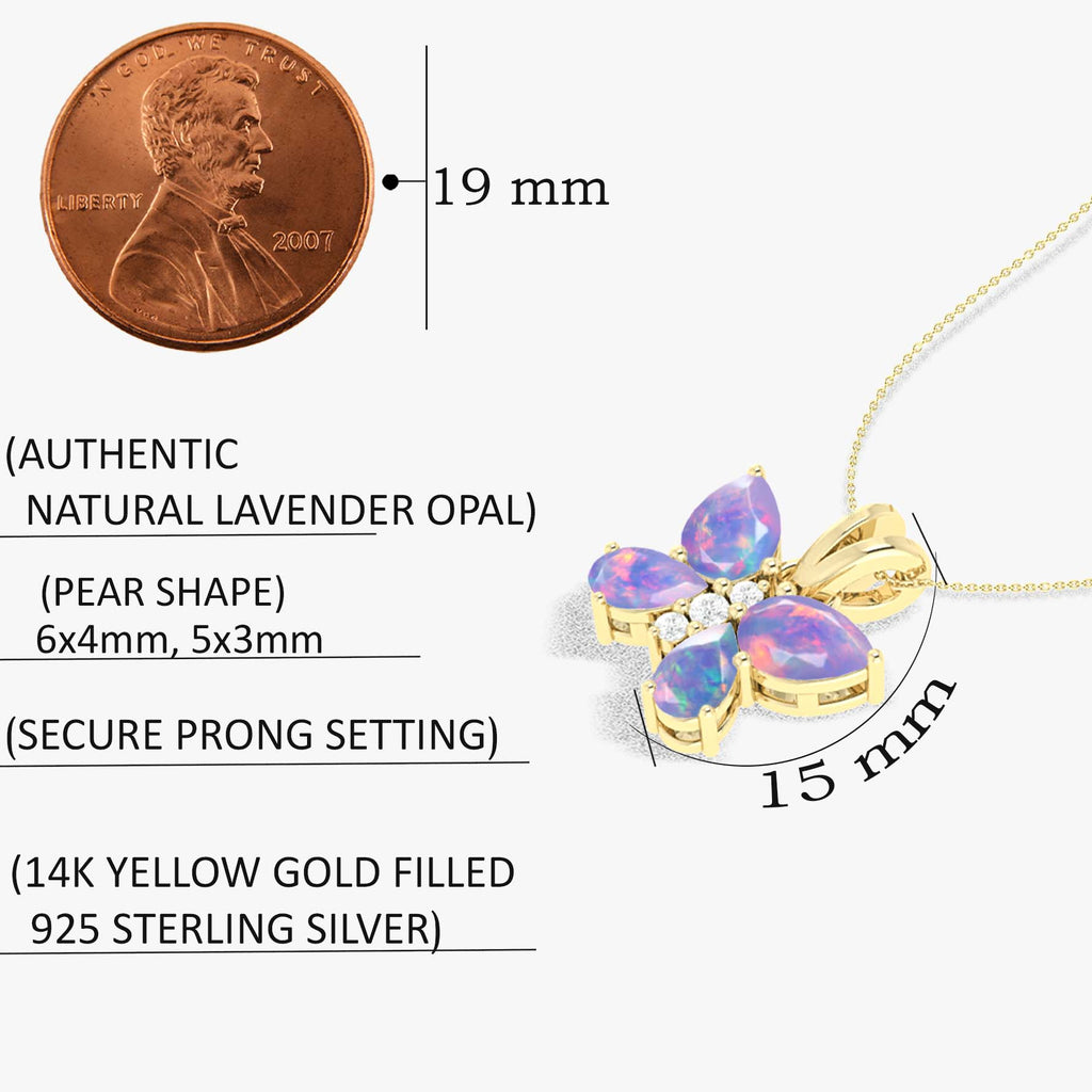 Lavender OpalAdd a touch of mystical elegance with our Lavender Opal Butterfly Pendant Necklace, beautifully crafted in 925 sterling silver. This enchanting pendant features 1.3 carats of luminous lavender opals, including two 6x4mm pear-shaped stones and two 5x3mm pear-shaped stones, arranged in a delicate butterfly design. Symbolizing transformation, beauty, and grace, this necklace is perfect as a thoughtful gift or a unique statement piece.