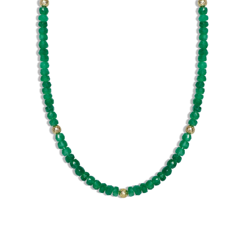 It is made from quality materials that include gold to offer a secure and comfortable necklace made of thin and fine chain. The beads are fashioned out of 18kt gold vermiel or 925 sterling silver and possess a smooth surface giving the golden beads an antique hue blending well with the green of the emeralds. Every component is then meticulously put together by talented craftsmen, making for a very high quality product.