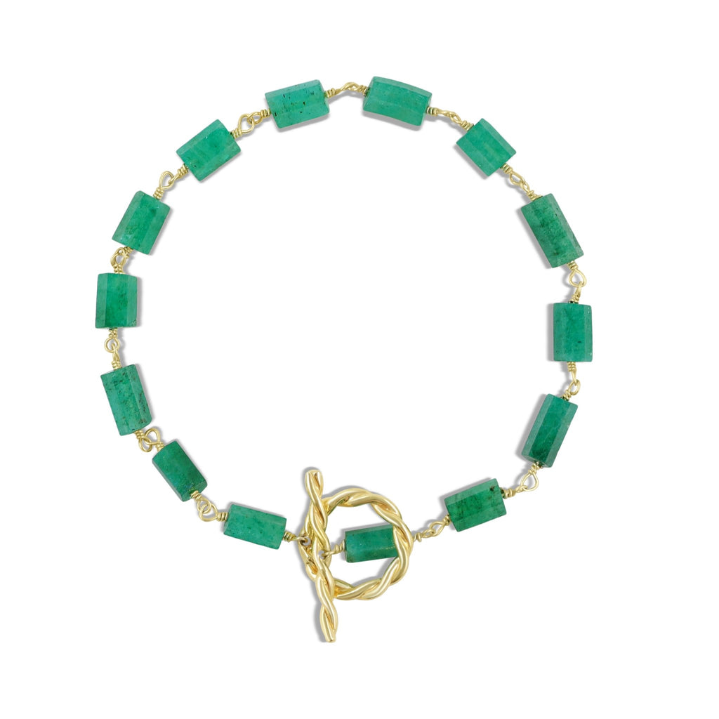 Beautiful emerald pencil-cut stones set in a sleek and contemporary style adorn this elegant bracelet. The distinctive pencil design gives the piece a modern edge, while the emeralds' vivid green color conveys a sense of richness and elegance. The toggle clasp adds a bit of sophistication to the bracelet's fashionable style while guaranteeing a secure fit.