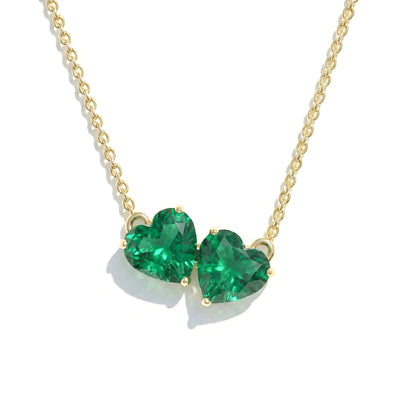 This Emerald Double Heart Pendant Necklace features two 5 mm faceted emeralds totaling 1.3 ct, set in yellow gold-plated brass. A delicate and elegant piece, ideal for everyday wear or gifting. Add sophistication and vibrant color to your look with this sparkling emerald heart necklace.