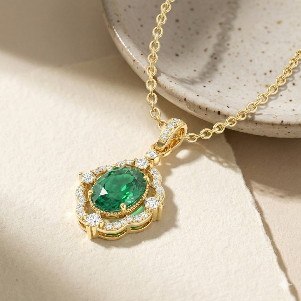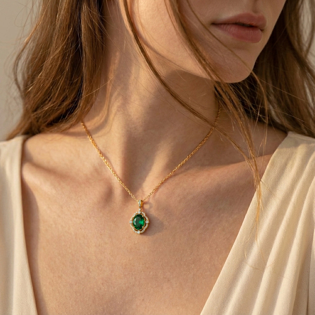 Add a touch of luxury with this Emerald Oval Halo Pendant Necklace in yellow gold-plated brass. Featuring a 1.2ct faceted oval emerald surrounded by sparkling CZ stones, the 25x12mm pendant hangs on a 16"+2" adjustable cable chain. Lightweight at 3.5g, it’s a versatile piece perfect for everyday elegance, special occasions, or gifting to someone special.