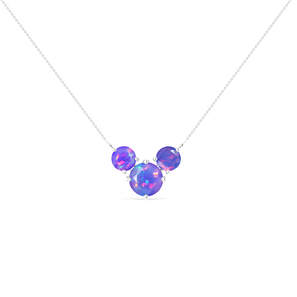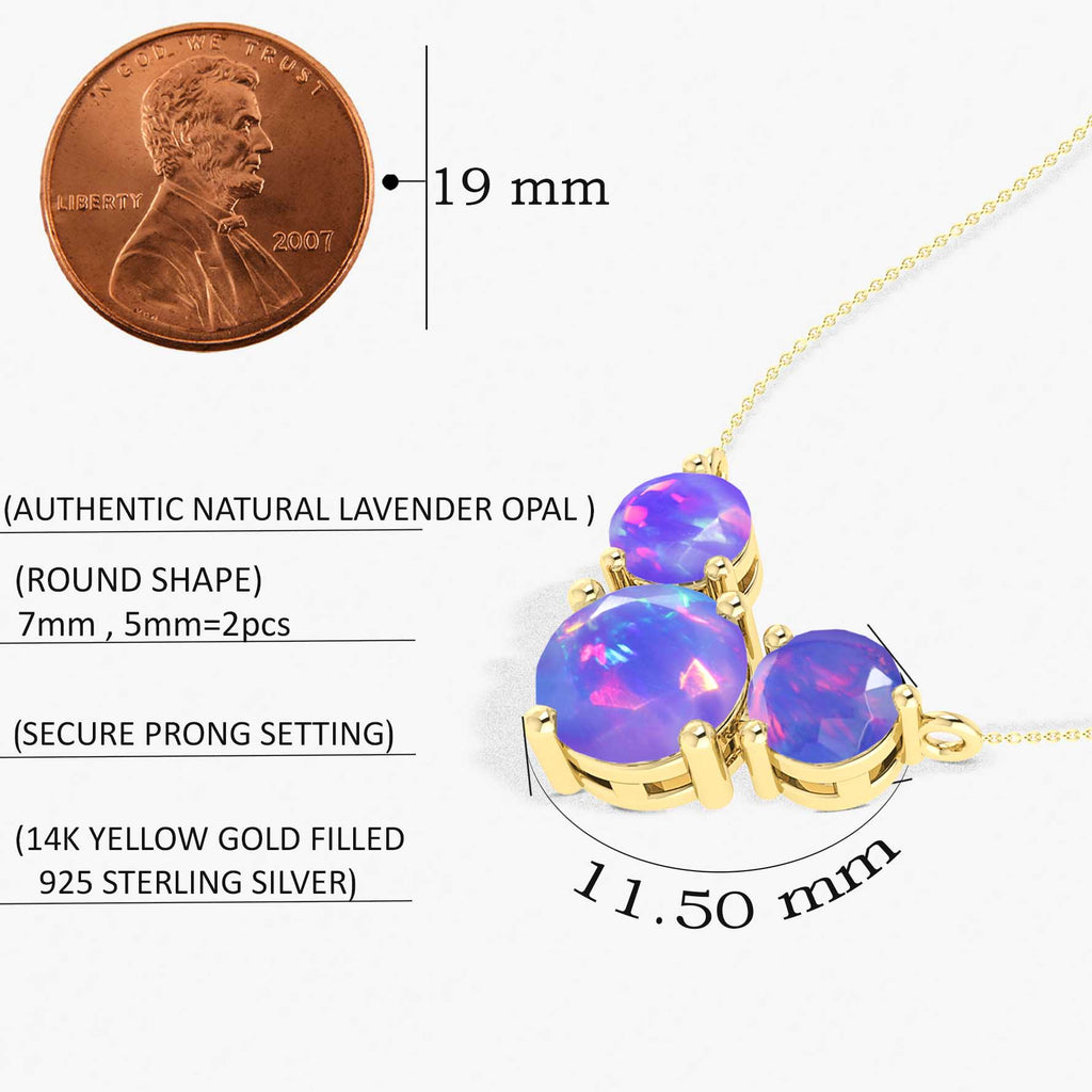 Lavender OpalAdd a touch of elegance and mystique with our Lavender Opal Round 3 Stone Pendant Necklace, expertly crafted in 925 sterling silver. This enchanting pendant features a 2.2-carat lavender opal centerpiece (7mm) flanked by two smaller 5mm round lavender opals, creating a timeless three-stone design that symbolizes love, harmony, and sophistication. Perfect for gifting or personal indulgence, this necklace combines classic charm with modern elegance.