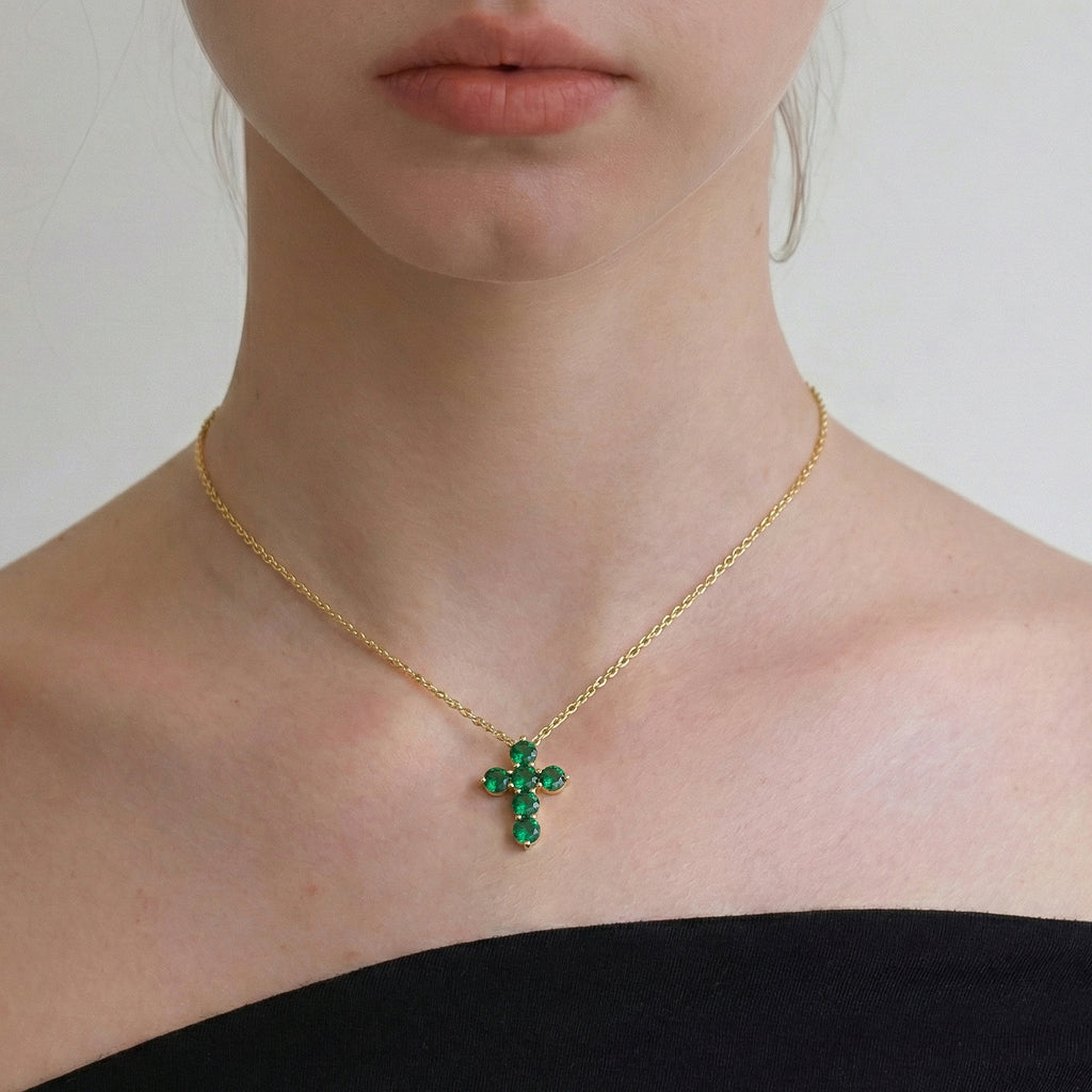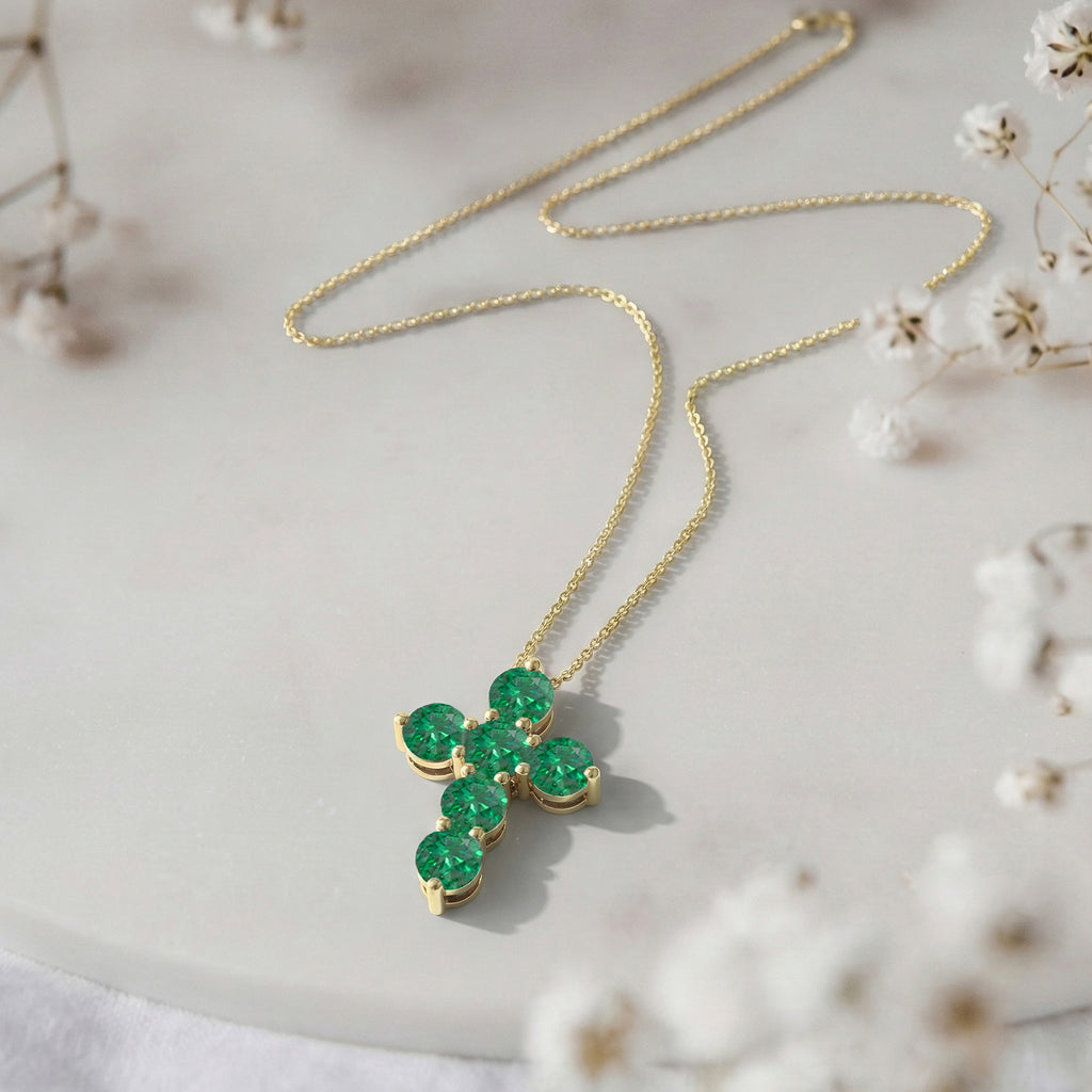 Luxurious and vibrant, this cross pendant necklace features six faceted round emerald gemstones (5 mm each) set in yellow gold plated brass. With a total carat weight of approximately 3.90 CT, the rich green stones create a striking, sparkling effect. The pendant measures 23.72 x 18.04 mm and hangs from a 16” + 2” adjustable cable chain with a secure lobster clasp. Weighing 7.50 gm with chain, this necklace is a timeless statement piece for everyday wear or special occasions.