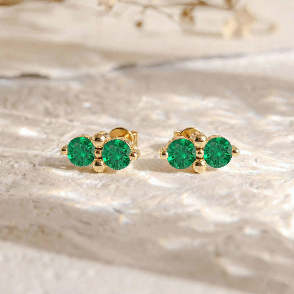 Shop these Emerald Round Stud Earrings in Yellow Gold Plated Brass for a sophisticated addition to your jewelry collection. Featuring four 3MM round emerald stones, totaling 1.20 carats, these earrings capture the vibrant green sparkle of emeralds. Set in yellow gold-plated brass, they create a timeless, elegant look. Measuring 8.31 mm and weighing 0.77 grams, these lightweight earrings are perfect for everyday wear or as a gift for May birthdays or anyone who loves elegant, colorful gemstone jewelry.