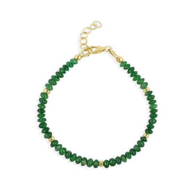 Natural emerald beads, valued for their rich green color and polished finish, are used in this exquisite bracelet. The vivid emeralds are painstakingly arranged along a fine chain to create a classic and elegant design that goes with every outfit. This bracelet fits ladies of all wrist sizes comfortably and securely thanks to its adjustable length, which can be adjusted from 6 to 8 inches.