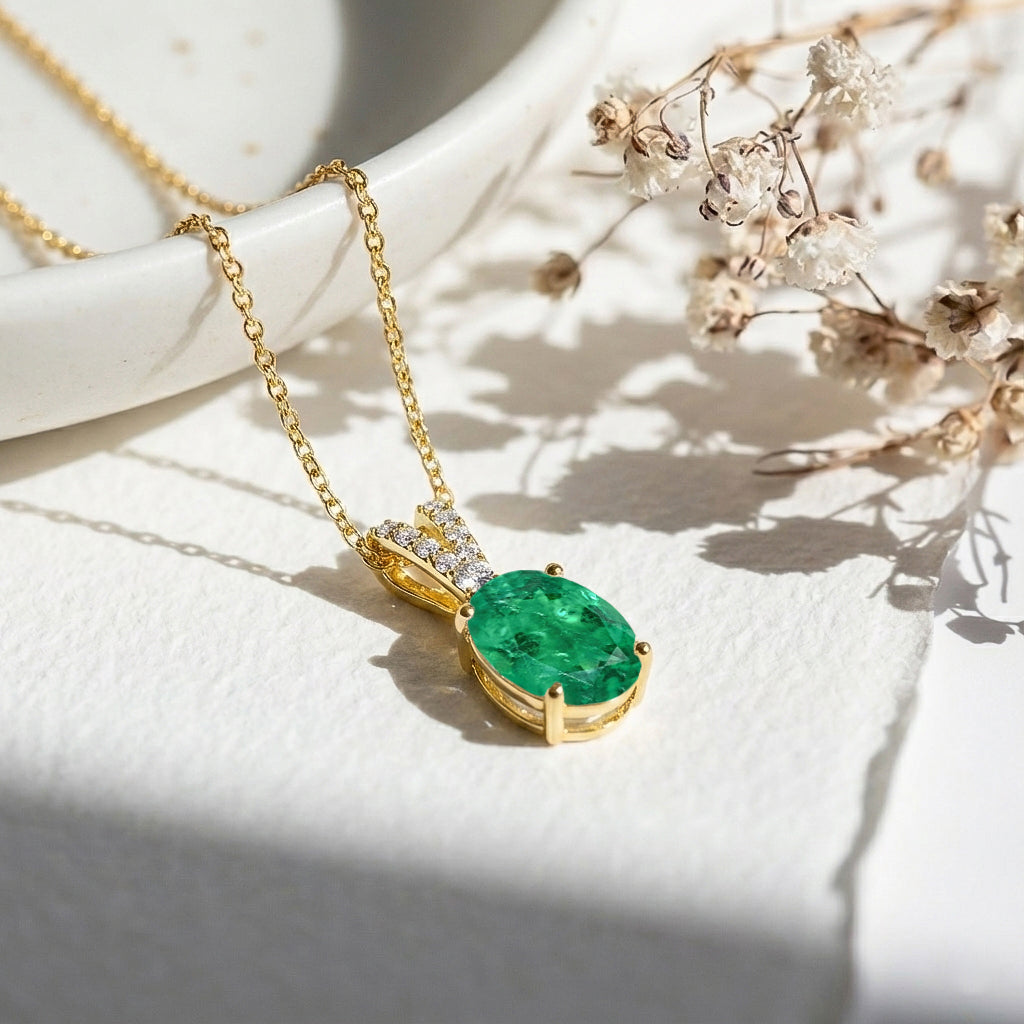 Add a touch of vibrant elegance with this Emerald Solitaire Pendant Necklace in yellow gold-plated brass. Featuring a 1.2 ct, 8×6 mm oval-cut emerald (approx. 1.5 ct CZ accent), the pendant measures 15.81 × 6.84 mm and is beautifully faceted for lasting sparkle. It hangs from a 16"+2" adjustable cable chain with a secure lobster clasp. Lightweight at 4 grams with chain, this necklace is perfect for everyday wear, special occasions, or gifting a timeless emerald jewelry piece.