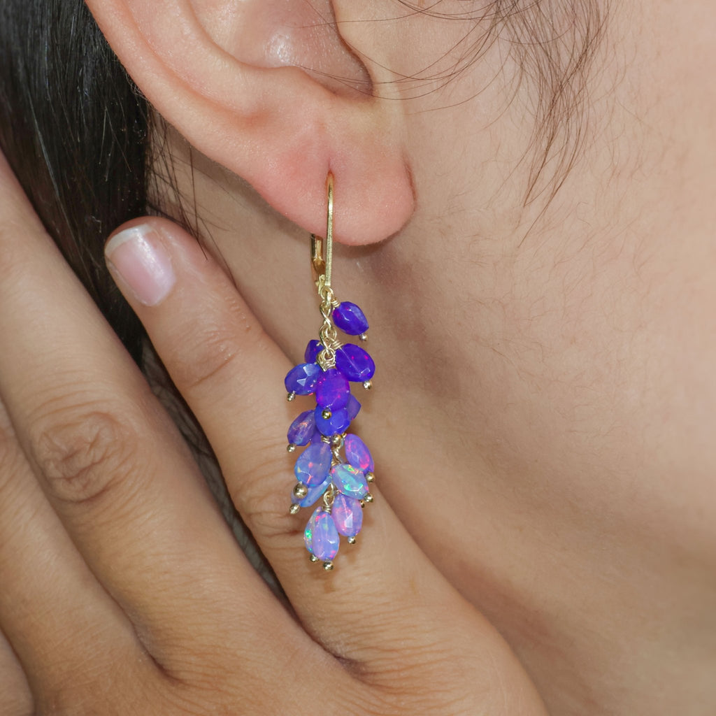 Lavender OpalAdd a touch of elegance to your jewelry collection with these stunning Natural Ethiopian Opal Earrings. Each pair features a unique cluster of black, blue, green, and lavender opal beads that create a captivating play of color. Crafted from high-quality 925 sterling silver and set in luxurious yellow gold-filled accents, these earrings are designed to enhance your style while offering durability and long-lasting wear. These earrings are perfect for any occasion, whether it's a birthday, anniversary, or engagement gift. Their versatile design complements both casual and formal attire, making them an ideal accessory for day-to-night wear. The natural opal stones are hand-selected for their vibrant colors, ensuring that every pair is a one-of-a-kind piece.