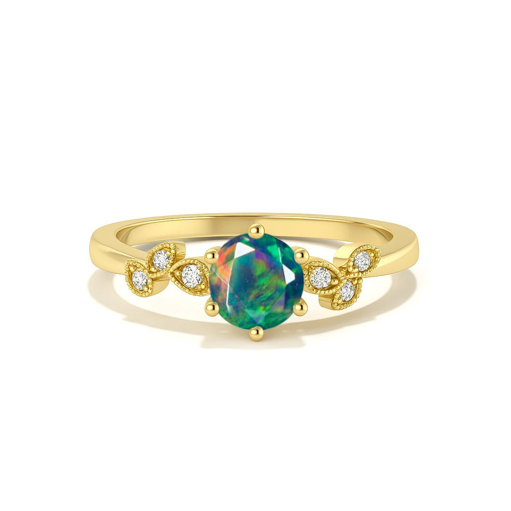 Black OpalDiscover timeless elegance with our Solitaire Black Opal & Cubic Zircon Ring—a perfect fusion of sophistication and modern charm. This exquisite ring showcases a 6mm natural round black opal at its center, radiating a captivating play of colors with every movement. The vibrant opal is beautifully complemented by delicate accents of sparkling cubic zircon stones, adding just the right touch of brilliance, Crafted in durable 925 sterling silver and finished with luxurious yellow gold plating, this ring offers a rich, golden hue and a comfortable fit. The faceted cut enhances the stone's natural fire, while the 0.80-carat total gemstone weight provides a refined yet eye-catching presence. With a metal weight of 3.20 grams, the design feels substantial without compromising on comfort.