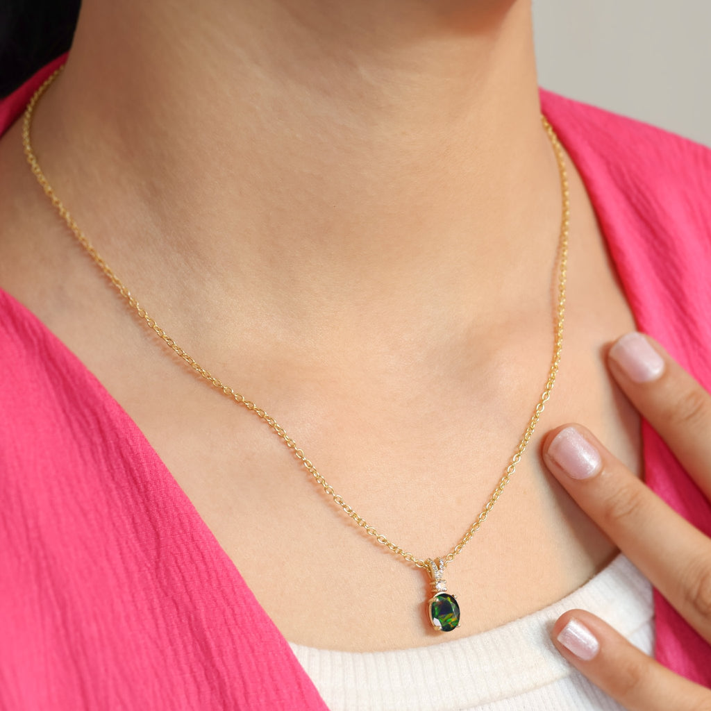Black OpalIntroducing the Black Opal Stone Charm Pendant! This beautiful necklace features a oval gemstone of stunning black opal. Wear it to add a touch of elegance and love to any outfit. Perfect for special occasions or everyday wear, this pendant is sure to dazzle and delight.