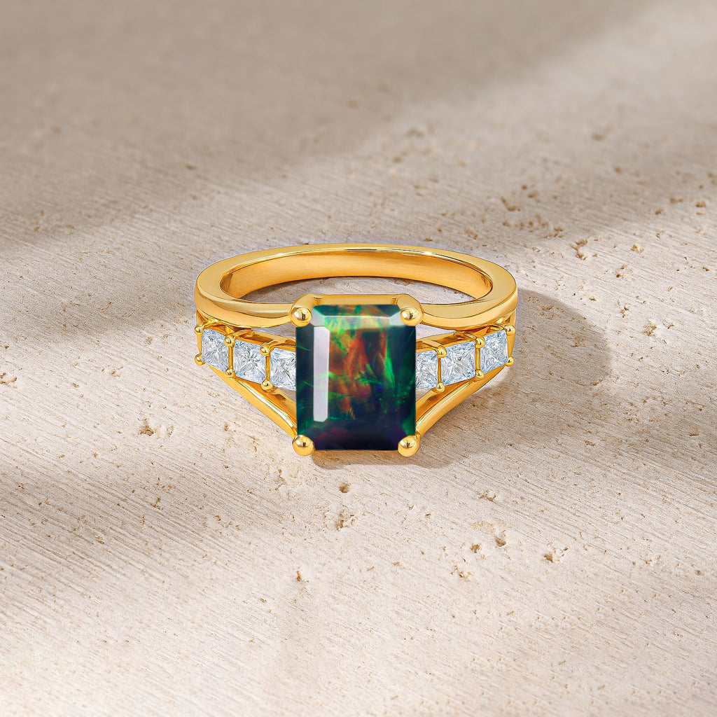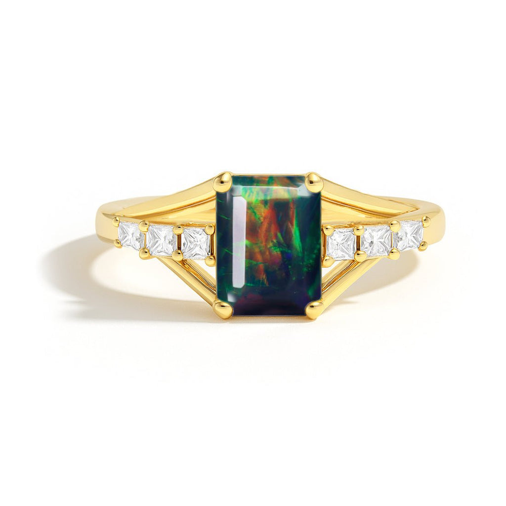 Black OpalMake a bold statement with this stunning Opal Gemstone Ring. Featuring a vibrant AAA natural opal (9x7mm octagon cut) at the center, this ring is accented with sparkling square diamonds on each side, adding brilliance and sophistication to its design.