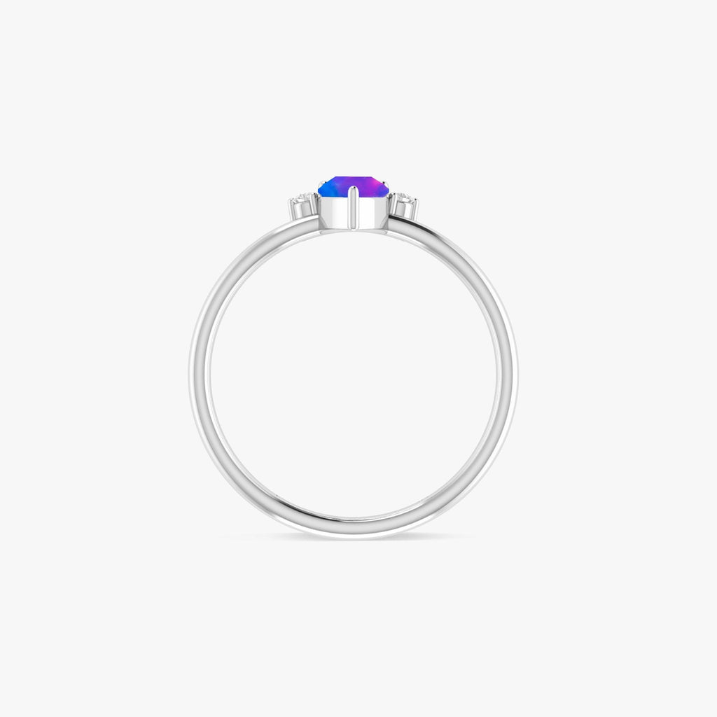 Blue OpalThis ring is a beautiful and unique piece that features a pear-shaped blue opal gemstone and a round CZ diamond gemstone. The blue opal is a stunning stone with a play of color, while the CZ diamond adds a touch of sparkle. The ring is made of sterling silver and is perfect for everyday wear or special occasions.