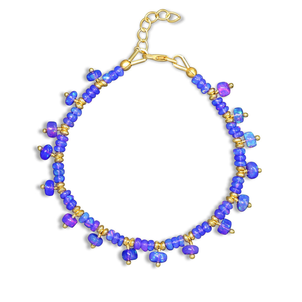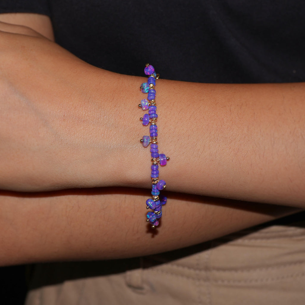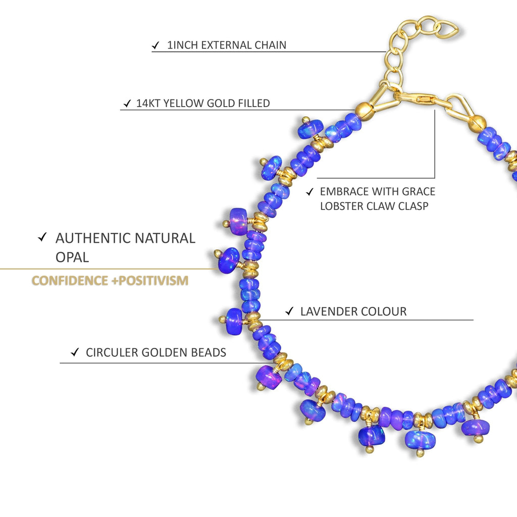 The stunning bracelet has rare Lavender Opal beads, which are renowned for their captivating color patterns and distinct lavender tones. With vibrant flashes of pink, purple, and soft blue, each opal bead emits a mesmerizing glow that shifts with each movement. This bracelet is genuinely unique since the opals are expertly strung to showcase their inherent beauty.