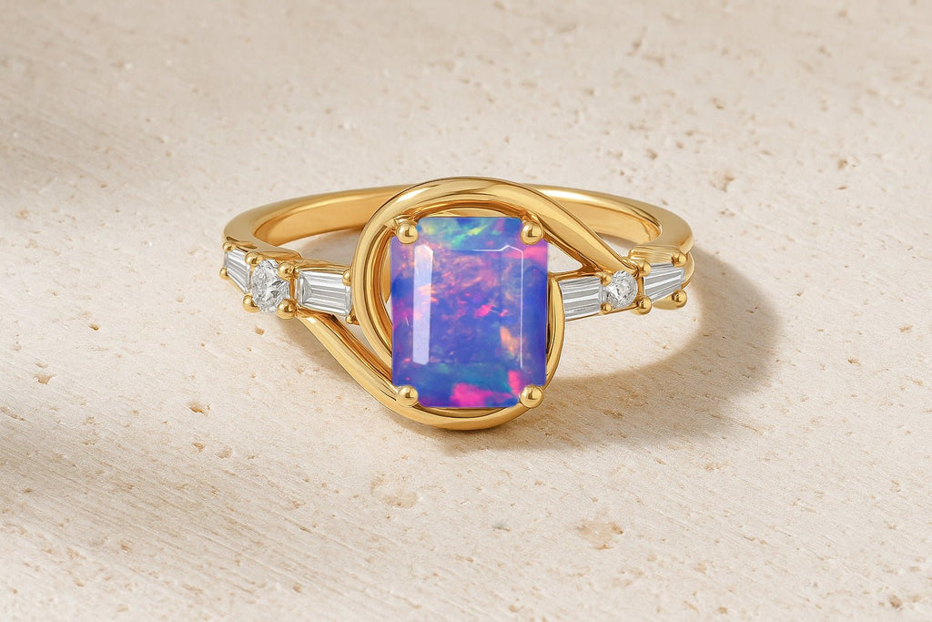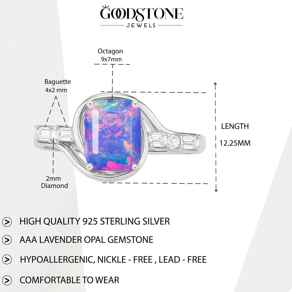 Lavender OpalMake a bold statement with this stunning Opal Gemstone Ring. Featuring a vibrant AAA natural opal (9x7mm octagon cut) at the center, this ring is accented with sparkling baguette and round diamonds on each side, adding brilliance and sophistication to its design.