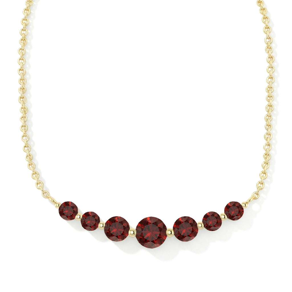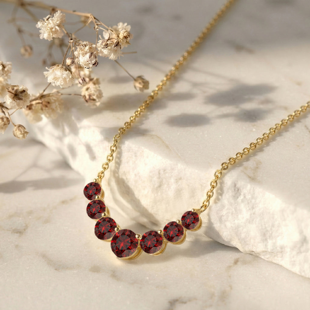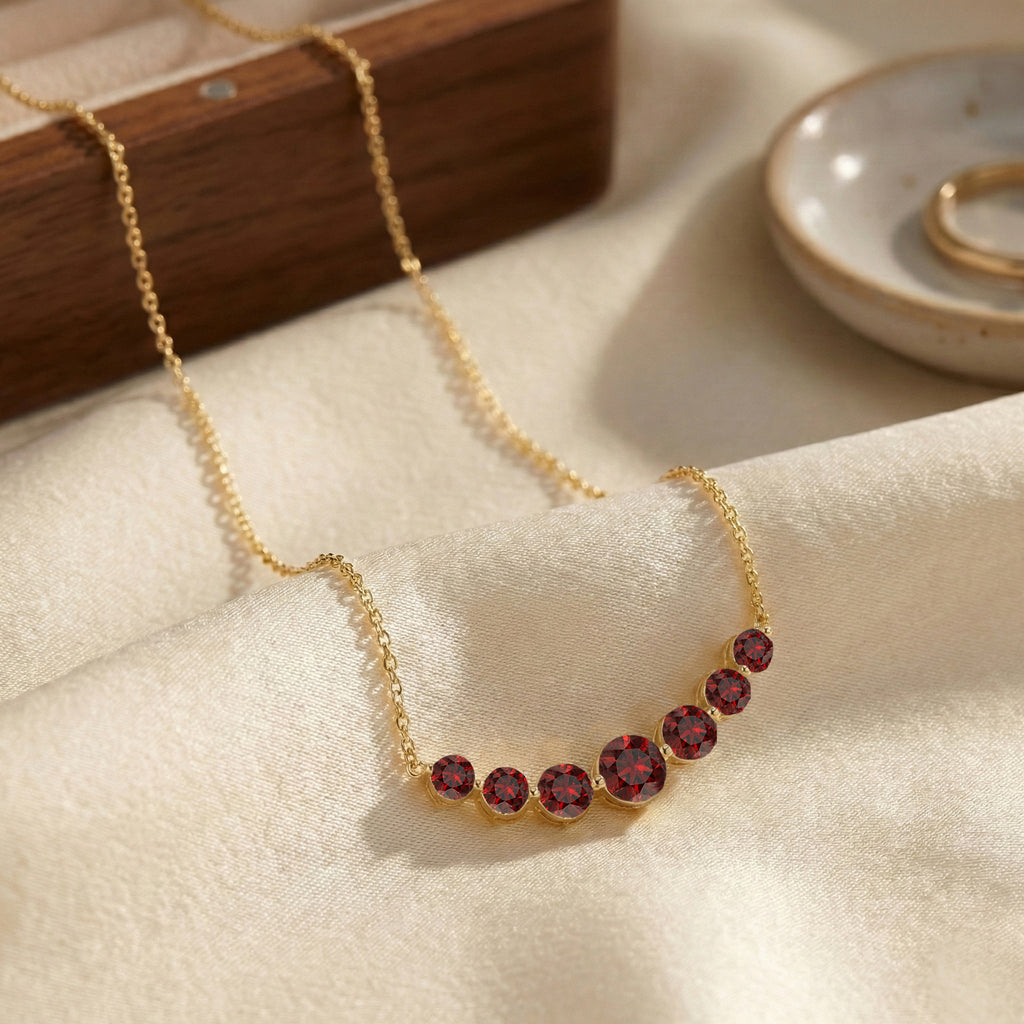 Add modern elegance with this Natural Garnet Curved Bar Necklace, crafted in yellow gold-plated brass. Featuring round faceted garnets in sizes 5mm, 4mm, and 3mm, totaling approximately 1.4 carats, the curved bar pendant measures 33.50 mm and hangs on a 16"+2" cable chain. Lightweight at 4.15g, it’s perfect for layering or wearing solo. Ideal as a birthstone jewelry gift or a contemporary statement piece, this necklace adds subtle sparkle and refined sophistication to any outfit.