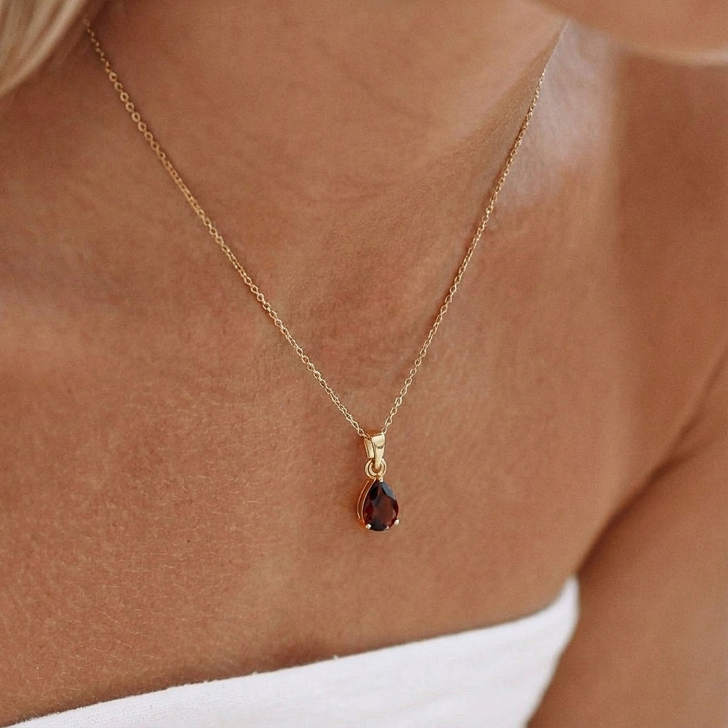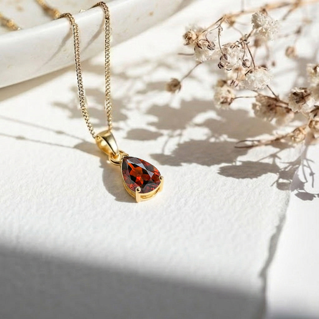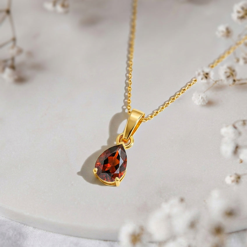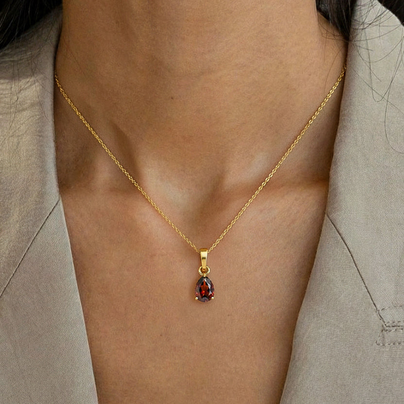 Add timeless elegance to your look with this Natural Garnet Pear Solitaire Teardrop Pendant Necklace. Featuring a faceted 9x7 mm pear-shaped garnet (approx. 1.4 carats), this radiant gemstone is set in yellow gold plated brass for a luxurious finish. The pendant measures 18.40 x 7 mm and hangs gracefully from a 16” + 2” adjustable cable chain with a secure lobster clasp. A perfect choice for everyday wear or meaningful gifting.
